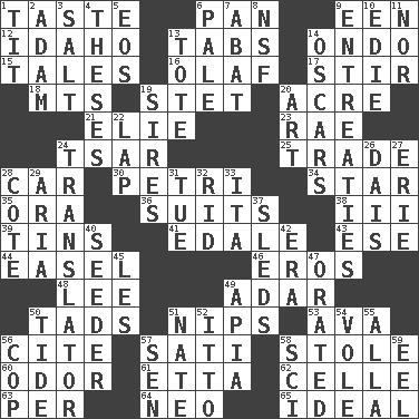 ACROSS 1. Clothes sense 6. Baking dish 9. Car or cant ending 12. Potato state 13. Bar bills 14. Southwest Nigerian state 15. Falsehoods 16. Norwegian king 17. Use a swizzle stick 18. Mountains (abbr.) 19. Proofreading order 20. Land measure 21. Writer Wiesel 23. Actress Charlotte 24. Russian ruler of old 25. Barter 28. 4-wheeled motor vehicle 30. _ dish (used to culture cells) 34. Play the lead 35. Mouth or opening 36. Sets of matching outer garments 38. One more than two 39. Canisters 41. Peak District village in England 43. Compass dir. 44. Artist's stand 46. Greek god of love 48. Area sheltered from the wind 49. The sixth month of the Jewish calendar 50. Bits 51. Pinches, bites 53. Actress Gardner 56. Quote 57. Suttee (variant) 58. Took without asking 60. Aroma 61. Singer James 62. Cell (Danish) 63. For each 64. Modern: prefix 65. Standard of perfection DOWN 1. Teat (slang) 2. First of billions? 3. Table seasoning 4. College papers 5. Greek goddess of the dawn 6. Light colored 7. Blind as ____ 8. Overdraft (abbr.) 9. Pleas 10. Singer Brickell 11. Not either 13. Carryall 14. Motion picture awards 19. Founders of families 20. Tate display 22. Pet locale 24. Interpreter 26. Raised platform 27. One of the Great Lakes 28. ____ d'Azur (French Riviera) 29. Operatic vocal solo 31. Third day of the wk. 32. To free from 33. Call ___ day 37. Bobsleighs 40. Sowing specialist 42. Period 45. French article 47. Declaimed 49. Capital of Western Samoa 50. Periodic rise and fall of the sea level 51. Nathan's nickname 52. "Tell ____ the Marines!" 54. Short-tailed, large-bodied rat 55. Silent film actress Nazimova 56. Police officer (slang) 57. Elected rep. 58. _-fi 59. Snakelike fish