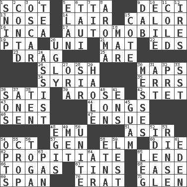 ACROSS 1. Native of Scotland 5. Singer James 9. Tenth: prefix 13. Characteristic smell of wine 14. Den 15. Bodily heat indicating an inflammation 16. South American Indian 17. Form of transportation 19. Parent Teacher Assoc. 20. Corn or form start 21. Floor protector 22. Begley and Asner 23. To trail on the ground 25. "We ___ not amused" (Victoria) 26. Agitate, as a liquid 30. Atlas contents 34. Damascus' land 35. Blunders 36. Suttee (variant) 39. Came up 42. Proofreading order 43. Washington bills 44. Yearns 46. Emitted 47. Follow as a consequence or result 48. Australian flightless bird 51. SW Saudi Arabia district 54. Sep. follower 57. Commissioned mil. rank 58. Shade tree 60. Expire 62. Appease 65. Grant temporary use of 66. Ancient Roman robes 67. Canisters 68. Relaxation 69. Connect, as a bridge 70. Part of Q.E.F. 71. Small, secluded valley DOWN 1. Sever or remove by pinching or nipping 2. Continued (abbr.) 3. Motion picture award 4. Beverage made from leaves 5. Enthusiasm 6. "Change" in Tahitian 7. Teat (slang) 8. Odor 9. Apply (a substance) by light strokes 10. Writer Wiesel 11. Lacking warmth 12. Angers 15. ____ d'Azur (French Riviera) 18. Impair 20. Unsightly 24. Help 27. Mouth or opening 28. Title for a knight 29. White Person, in Hawaii 30. Makes clutter 31. Tate display 32. Before (prefix) 33. Fast jet (abbr.) 36. Distress signal 37. One (Scot) 38. Nine, plus one 40. Male child 41. Followers of ems 45. Island territory of the United States 48. Armor plate that protects the chest 49. Was introduced to 50. Join together 52. Perfect 53. Wash lightly 54. Elects 55. Riding implement 56. Ancient Roman robe 58. Inactive volcano in Sicily 59. For fear that 61. Paradise 63. Baking dish 64. Atmosphere 65. Part of a journey