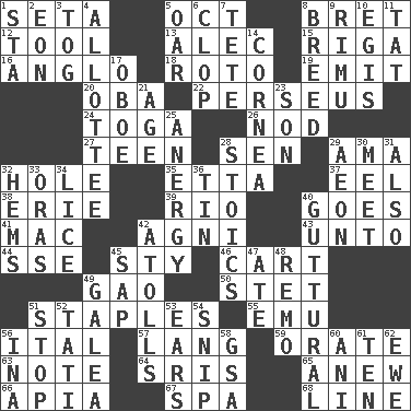 ACROSS 1. Bristle 5. Sep. follower 8. Cy Young winner Saberhagen 12. Utensil 13. Actor Baldwin 15. Port city in Latvia 16. White American of non-Hispanic descent 18. Printing process, for short 19. Send forth 20. Chief or king in Benin or Nigeria 22. Son of Zeus who helped slay Medusa 24. Ancient Roman robe 26. Lower and raise head in agreement 27. Adolescent 28. Elected rep. 29. Housemaid (var.) 32. Hollow 35. Singer James 37. Snakelike fish 38. One of the Great Lakes 39. _ de Janeiro 40. Leaves 41. Big _ 42. Hindu god of fire 43. To (old English) 44. Compass dir. 45. Filthy place 46. Draw slowly or heavily 49. E Mali city 50. Proofreading order 51. Paper fasteners 55. Australian flightless bird 56. Slanted text style (abbr.) 57. Long (Scottish) 59. Declaim 63. Musical sound 64. Indian titles of respect 65. Afresh 66. Capital of Western Samoa 67. Health resort 68. Actor's bit DOWN 1. R.R. building 2. Age 3. Coat; cloak 4. One to whom something is allotted 5. Rowing implement 6. Hoof sound 7. False hair 8. A special lineage 9. Tall New Zealand timber tree 10. Armor plate that protects the chest 11. Make lace 14. Pupil covering 17. Mitch Miller's instrument 21. Ripen 23. Manchild 25. Disorder of the immune system 28. Unemotional ones 29. Age 30. Confront 31. In addition 32. Cloth borders 33. Mouths or openings 34. Louse (plural) 36. Metal container 40. From the throat 42. Ringlike coral islands and reefs 45. Plant excrement 47. Had dinner 48. San ____ (Riviera town) 49. An organ shaped like a helmet 51. Cease 52. Jacques of French films 53. Hearing organs 54. Sever or remove by pinching or nipping 56. _ tizzy (2 wds.) 58. Girls' org. (abbr.) 60. Black tropical American cuckoo 61. Nine, plus one 62. She-sheep