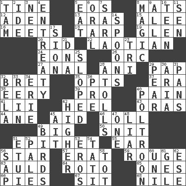 ACROSS 1. Prong on a fork 5. Greek goddess of the dawn 8. Floor protectors 12. Arabian gulf 13. Caspian sea tributary 15. Toward shelter 16. Confronts 18. Canvas cover 19. Small, secluded valley 20. To free from 22. Of or relating to Laos or its people 24. Immeasurably long periods of time 26. The grampus (Milton) 27. Of or related to the anus 28. Cuckoo 29. Infant food 32. Cy Young winner Saberhagen 35. Elects 37. Period 38. Suggestive of the supernatural 39. Adept person 40. Ache 41. Cards in a Roman deck? 42. The bottom of a shoe or boot 43. Mouths or openings 44. A saturated hydrocarbon 45. Help 46. Hang loosely or laxly 49. Massive 50. In a ____ (agitated or irritated) 51. Curse 55. Hearing organ 56. Play the lead 57. Part of Q.E.F. 59. Makeup applied to the cheeks 63. Old (Scot.) 64. Printing process, for short 65. Washington bills 66. Sliced desserts 67. Be seated 68. The longest river in the world DOWN 1. Scottish cap 2. Binary compound 3. Born 4. Plea 5. Consume 6. Spoken 7. "Two Mules for Sister ____" 8. Mysterious quality of enchantment 9. Silent film actress Nazimova 10. Adolescent 11. Elected rep. 14. Soup utensils 17. The Jewish people; Israel 21. Heredity factor (abbr.) 23. Three (prefix) 25. Slanted 28. Ringlike coral islands and reefs 29. Lightbulb-shaped fruit 30. Roberta Peters solo 31. Baking dishes 32. Actor Lugosi 33. It's straight from the horse's mouth 34. One of the Great Lakes 36. Before (prefix) 40. Characterized by complete cowardliness 42. Having greater elevation 45. Small island 47. Single 48. One who doesn't tell the truth 49. Avian creatures 51. Needle case 52. Light colored 53. Greek god of love 54. Jacques of French films 56. Plant excrement 58. Small child 60. University (slang) 61. Set 62. Compass dir.