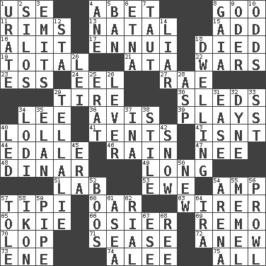 ACROSS 1. Purpose 4. Collude with 8. Thick or sticky substance 11. Basketball hoops 13. Brizilian seaport 15. Increase 16. Came down and settled, as after flight 17. World-weariness 18. Passed on 19. Add up to 21. _ moment's notice (2 wds.) 22. Armed conflicts 23. Curvy letter 24. Snakelike fish 27. Actress Charlotte 29. Hoop that covers a wheel 30. Bobsleighs 34. Area sheltered from the wind 36. Advice 39. Live dramatic performances 40. Hang loosely or laxly 41. Portable shelters 43. Is not 44. Peak District village in England 46. Precipitation 47. Born 48. Middle Eastern gold or silver currency 49. Having great length 51. Experiment locale 53. She-sheep 54. Electrical Unit 57. Native american tent (variation) 60. Boat paddle 63. One who wires 65. Migrant worker of the '30s 66. Flexible twig of a willow tree 69. San ____ (Riviera town) 70. Chop off 71. Gospel singer Marvin 72. Afresh 73. Compass dir. 74. Toward shelter 75. Everything DOWN 1. A salt of uric acid 2. Grain storage towers 3. Gives off 4. One (Scot) 5. Prohibit 6. Inactive volcano in Sicily 7. Strained 8. Greek goddess of the earth (variant) 9. River in Europe 10. Likelihood 12. R.R. building 14. One who doesn't tell the truth 18. Residence 20. Luau accessory 25. Part of Q.E.F. 26. Crowbar 28. Cleo's killer 29. Copy Pinocchio 31. Relaxation 32. Centimeter-gram-second unit of force 33. Fast jet (abbr.) 34. Farming town in central California 35. Flair 37. _ tizzy (2 wds.) 38. Vertical member of a panel or frame 40. Directed 42. Overwhelm 45. Epoch 50. ___ Haven, CT 52. Scornful sounds 54. Sports stadium 55. Klaipeda city 56. Move like a hungry wolf 57. Lacquered or enameled metalware 58. Image 59. Corncob 61. Toward the sea 62. Monetary unit of Yemen 64. Retirement account (abbr.) 67. Compass dir. 68. Portuguese money of account (variant)