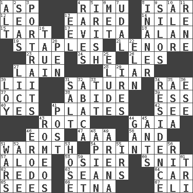 ACROSS 1. Cleo's killer 4. Tall New Zealand timber tree 8. Austrian river, tributary to the Danube 12. Lion 13. Having ears or earlike features 14. "Death on the ____" 15. Small pie 17. Webber/Rice musical 18. ____ Jay Lerner 19. Paper fasteners 21. Poe poem 23. Sorrow 24. A female animal or person 26. French article 27. (Had) reclined 28. One who doesn't tell the truth 30. Cards in a Roman deck? 31. Titan orbits this 34. Actress Charlotte 37. Sep. follower 38. Remain 39. Curvy letter 40. It is so 41. Food holders 42. Perceive with the eye 43. College mil. group 44. Greek goddess of the earth (variant) 46. Greek goddess of the dawn 47. American Automobile Association (abbr.) 50. Added to 51. Heat 54. Hard copy producer 57. Medicinal plant 58. Flexible twig of a willow tree 60. In a ____ (agitated or irritated) 62. Do over again 63. Actors Connery and Penn 64. Auto 65. Observes 66. Inactive volcano in Sicily 67. Biblical high priest DOWN 1. Keyboard modifier key 2. Oceans 3. Likenesses of persons 4. All-night dance parties 5. From or relating to Ireland 6. Was introduced to 7. Hereditary estate 8. More lacking in sense or substance 9. Grain storage towers 10. Having or resembling wings 11. French philosopher Descartes 13. Snakelike fish 16. "Change" in Tahitian 20. Writing instrument 22. Liveliness 25. Evade 27. Louse (plural) 29. Angers 30. Myrna of the movies 31. Table seasoning 32. Phillipine bananalike plant 33. Teat (slang) 34. Dwelling 35. Toward the sea 36. Compass dir. 41. Mail 43. Lover boys 44. Separate the seeds from cotton 45. Pismires 46. Wear away 48. Bee-related 49. Sports stadium 51. Armed conflicts 52. Toward shelter 53. Stockings 55. Big collection agency 56. Monetary unit of Yemen 59. Arrange properly for use 61. Three (prefix)