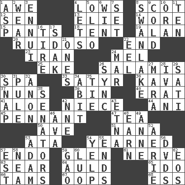 ACROSS 1. Deep reverence 4. Moos 8. Native of Scotland 12. Elected rep. 13. Writer Wiesel 14. Had on 15. Leg coverings 18. Portable shelter 19. ____ Jay Lerner 20. Boisterous (Brazilian Portuguese) 22. Conclude 23. SW Asia republic 24. Cartoonist voice _ Blanc 25. Supplement with great effort 26. Deli grouping 30. Health resort 33. Letch 36. Polynesian shrub of the pepper family 37. Religious women 39. Storage container 40. Part of Q.E.F. 41. _ vera 42. Sibling's daughter 44. Black tropical American cuckoo 45. Pre-World Series prize 47. Afternoon social gathering 50. "___ Maria" 51. Nanny 53. "One Day ___ Time" 54. Had a strong desire 57. Inside; within (prefix) 59. Small, secluded valley 61. Impudent aggressiveness 63. Singe 64. Old (Scot.) 65. Wedding promise 66. Scottish caps 67. I made a mistake 68. Curvy letter DOWN 1. Viper 2. Erode 3. World-weariness 4. Allows 5. Margarine 6. Acquire through effort 7. Put into a specified state 8. Tchaikovsky ballet 9. Lacking warmth 10. Mouth or opening 11. Nine, plus one 16. Become fatigued 17. Neighbor of Neb. 21. Singles 22. Snakelike fish 24. Impair 26. Synchronize (abbr.) 27. Hindu Mythology: god of death 28. "Terrible" tsar 29. Suttee (variant) 30. Fastener 31. Whimper 32. Soon (poet.) 34. "This won't hurt ____!" 35. Standoff 38. Elected representatives 42. Compass dir. 43. Inactive volcano in Sicily 46. Actress Gardner 48. Merit 49. Queen of England 1702-14 52. Nest on high 53. First of billions? 54. Sharp bark 55. Extremities 56. Movie discs 57. Eastern Standard Time (abbr.) 58. Teachers' org. 59. E Mali city 60. Nilotic language 62. Greek goddess of the dawn