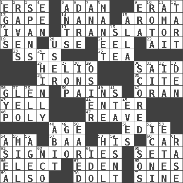 ACROSS 1. Celtic language 5. First of billions? 9. Part of Q.E.F. 13. Stare wonderingly 14. Grandmother 15. Scent 16. _ the terrible 17. Interpreter 19. Elected rep. 20. Purpose 21. Snakelike fish 22. Small island 23. Fast planes 25. Afternoon social gathering 26. Sun: prefix 30. Expressed in words 34. Metal shackles 35. Quote 36. Small, secluded valley 39. Aches 42. NW Algerian seaport 43. Shout 44. Keyboard key 46. Much (prefix) 47. Rob, plunder, or pillage 48. Personal question 51. Singer Brickell 54. Nursemaid (var.) 57. Sound made by sheep 58. Part of HMS, perhaps 60. Auto 62. Seigniories (variant) 65. Bristle 66. Voters do this 67. Paradise 68. Singles 69. In addition 70. Stupid person 71. Trig term DOWN 1. The front part of a cuirass 2. All-night dance parties 3. Connects, as a bridge 4. Car or cant ending 5. Pismires 6. Have the gumption 7. Santa ___, CA 8. French painter Edouard 9. Period 10. Roll call or roster of names 11. Mine, in Marseilles 12. Small pie 15. Silent film actress Nazimova 18. Perceive with the eye 20. One who makes use of a thing 24. Without force or sincere effort 27. Chop off 28. _ tizzy (2 wds.) 29. Flexible twig of a willow tree 30. Tallied 31. Atmosphere 32. Call ___ day 33. Lair 36. Hustle 37. Lion 38. Pipe bend 40. Compass dir. 41. R.R. building 45. Nights before holidays 48. "This won't hurt ____!" 49. E Mali city 50. Having ears or earlike features 52. Ancient Celtic tribe of eastern Britain 53. Consumed 54. At sea 55. Place where flour is made 56. Eons 58. Person who is morally reprehensible 59. Is not 61. Raze (variant) 63. Non-commissioned officer (abbr.) 64. Wedding promise 65. Mayday