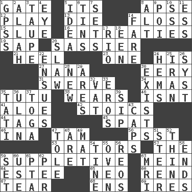 ACROSS 1. Yard entry 5. It is 8. Domed church section 12. Romp 13. Expire 14. Soft thread for cleaning between teeth 15. Turn sharply 16. Pleas 19. Plant excrement 20. More impudent 21. Person who is morally reprehensible 23. Single 24. Part of HMS, perhaps 27. Grandmother 30. Suggestive of the supernatural 31. Turn aside suddenly 34. Dec. holiday 35. Ballerina skirt 38. Erodes 40. Is not 41. Medicinal plant 42. Unemotional ones 44. Labels 45. Argument over a trivial matter 46. _ tizzy (2 wds.) 47. Scottish cap 50. Inconspicuous attention getter 53. Speakers 57. Definite Article 59. Supplementary 63. Count _ (2 wds.) 64. First name in cosmetics 65. Modern: prefix 66. Tear apart 67. Pull into pieces 68. Followers of ems 69. Angers DOWN 1. Global Positioning Systems (abbr.) 2. Assad's deity 3. Grayish beige 4. Sight organ 5. The content of cognition 6. Canisters 7. Arranges properly for use 8. Keyboard modifier key 9. Luau course 10. Compass dir. 11. Double-curved letter 14. Conductor's collection 17. River (Sp.) 18. Car or cant ending 20. Cole _ (cabbage dish) 22. Follows as a consequence or result 24. Folds over and sews together 25. SW Asia republic 26. System (abbr.) 28. ___ Haven, CT 29. Ancient Greek god of war 30. Is extant 32. Large container 33. Greek god of love 35. Jacques of French films 36. ____ Bator, Mongolia 37. Ancient Roman robe 39. Small drink 43. Balmoral and tarboosh 47. Lacquered or enameled metalware 48. "We ___ not amused" (Victoria) 49. Floor protector 51. Navigate 52. One or ones belonging to thee 54. Prong on a fork 55. Baking chamber 56. Vintage cars 58. Conclusions 59. Put into a specified state 60. Purpose 61. Parent Teacher Association (abbr.) 62. For each 63. Medical imaging device (abbr.)