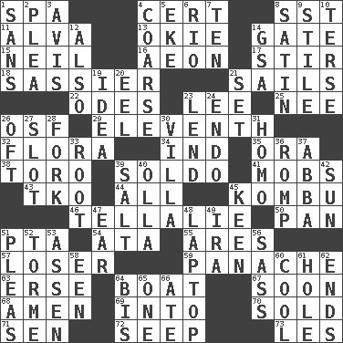 ACROSS 1. Health resort 4. Certainty 8. Fast jet (abbr.) 11. Inventor's middle name 13. Migrant worker of the '30s 14. Yard entry 15. Famous astronaut Armstrong 16. A really long time 17. Commotion 18. More impudent 21. Moves on water 22. Lyric poems 23. Area sheltered from the wind 25. Born 26. Order of Saint Francis (abbr.) 29. Veterans Day date 32. Plants 34. Indiana (abbr.) 35. Mouth or opening 38. "Corrida" creature 39. Twentieth part of a lira 41. Crowds into 43. Ring climax 44. 100% 45. Dried seaweed eaten as food 46. Copy Pinocchio 50. Baking dish 51. Parent Teacher Assoc. 54. _ moment's notice (2 wds.) 55. Ancient Greek god of war 57. Failure 59. Flamboyance 63. Celtic language 64. Water vessel 67. Within a short period 68. So be it 69. To the inside or interior of 70. Disposed of to a purchaser 71. Elected rep. 72. Ooze 73. French article DOWN 1. Without 2. Entreaty 3. Opinion 4. Rough 5. Make supply last 6. River (Sp.) 7. "___ Little Indians" 8. Smooth fabric 9. Vertical member of a panel or frame 10. Laconic 12. In addition 14. Girls' org. (abbr.) 19. The main thing one is thinking about 20. Snakelike fish 21. Arrange properly for use 23. Grant temporary use of 24. Inside; within (prefix) 26. Often (poetically) 27. Slit 28. Tined utensil 30. Country residence 31. Same (prefix) 33. Carrot, for example 36. Frolic 37. Swedish rock group 39. Table seasoning 40. Rounded earthenware pot or jar 42. Player for Phoenix 45. Peachy ____! 47. Hearing organ 48. Portable computer 49. Lyricist Gershwin 51. Entreaties 52. Singer Mel 53. NE Netherlands city 56. Backtalk 58. Car or cant ending 60. Calm and collected 61. Opening into or through something 62. Extremities 64. Altar cloth linen 65. Single 66. Had dinner