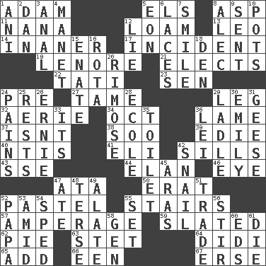 ACROSS 1. First man 5. Raised railways 8. Viper 11. Nanny 12. Rich soil 13. Lion 14. More empty; more void 17. Event 19. Poe poem 21. Chooses 22. Jacques of French films 23. Elected rep. 24. Before (prefix) 27. Not wild 29. Part of a journey 32. Nest on high 34. Sep. follower 36. Unable to walk 37. Is not 38. "Barney Miller" actor Jack 39. Singer Brickell 40. Nuclear Threat Initiatives 41. Biblical high priest 42. Beverly of Met fame 43. Compass dir. 44. Liveliness 46. Sight organ 47. _ moment's notice (2 wds.) 50. Part of Q.E.F. 52. Soft color 55. Flight of steps 57. Electrical Measurement 59. Scheduled 62. Sliced dessert 63. Proofreading order 64. "You Light Up My Life" star Conn 65. Increase 66. Car or cant ending 67. Celtic language DOWN 1. Cuckoo 2. One of the 12 tribes of Israel 3. Of or related to the anus 4. French painter Edouard 5. Period of immesurable duration 6. Shoestrings 7. Grin 8. Actor Baldwin 9. Transmitted 10. Cooking vessels 12. Untruth 15. Related on the mother's side 16. Round or rotation of duties 18. Lair 20. Full of chinks, cracks, or crevices 24. Aches 25. Musical pauses 26. Bert's buddy 28. Learning spot: Fr. 29. Dipping utensil 30. Poet Dickinson 31. Honkers 33. It is 35. Bathroom 36. Luau accessory 42. Slow-paced one 45. Ancient river in northeast Turkey 47. Had dinner 48. Laconic 49. Having winglike extensions 51. Buy and sell 52. Dad 53. Among 54. Drove too fast 55. Arrange properly for use 56. Commotion 58. Commissioned military rank (abbr.) 60. Begley and Asner 61. Expire