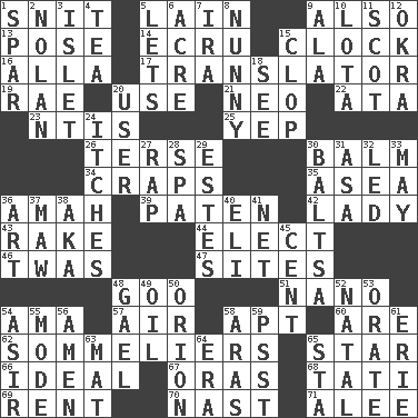ACROSS 1. In a ____ (agitated or irritated) 5. (Had) reclined 9. In addition 13. Airs 14. Shade of tan 15. Timepiece 16. Silent film actress Nazimova 17. Interpreter 19. Actress Charlotte 20. Purpose 21. Modern: prefix 22. "One Day ___ Time" 23. Nuclear Threat Initiatives 25. Slangy assent 26. Laconic 30. Lip ointment 34. Dice game 35. Toward the sea 36. Nursemaid 39. Eucharist need 42. Kenny Rogers chart-topper in '80 43. Immoral or dissolute person 44. Opt 46. It was, poetically 47. Locates 48. Thick or sticky substance 51. Billionth: prefix 54. Housemaid (var.) 57. Atmosphere 58. Fitting 60. "We ___ not amused" (Victoria) 62. Wine waiters 65. Play the lead 66. Standard of perfection 67. Mouths or openings 68. Jacques of French films 69. Monthly bill 70. Political cartoonist Thomas 71. Toward shelter DOWN 1. Coast Guard woman 2. Pitcher Ryan 3. Small island 4. Afternoon social gathering 5. Allows 6. 1/640 square mile 7. Lyricist Gershwin 8. Pet term 9. Wing 10. Globular water bottle used in Asia 11. Highlander 12. Gumbo ingredient 15. Hoof sound 18. Observe 20. One who makes use of a thing 24. Irritating cutaneous sensations 27. Hit sharply and swiftly 28. Health resort 29. _____ Park, CO 30. Greek mezzo-soprano Agnes 31. White ___ sheet 32. Directed 33. Can I? 36. Tate display 37. Informal term for the mouth 38. Alias (abbr.) 40. Biblical high priest 41. Fish or hair follower 45. Penny 48. Highlander 49. Petroleum 50. Constellation of myth 52. Relating to or accompanying birth 53. Speak pompously 54. SW Saudi Arabia district 55. Method 56. So be it 58. Ancient river in northeast Turkey 59. Inconspicuous attention getter 61. 4th largest of the Great Lakes 63. Floor protector 64. Period 65. R.R. building
