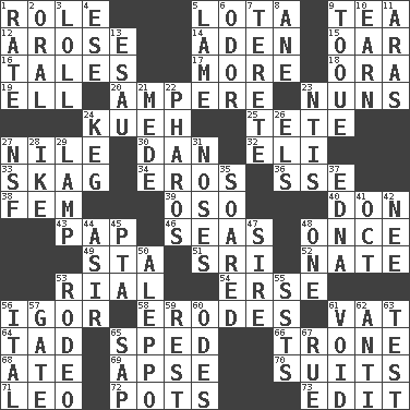 ACROSS 1. Hero or heavy, e.g. 5. Globular water bottle used in Asia 9. Afternoon social gathering 12. Came up 14. An important port of Yemen 15. Boat paddle 16. Lies 17. Greater amount 18. Mouth or opening 19. Pipe bend 20. Electrical Unit 23. Religious women 24. Malaysian steamed pastry 25. Wig 27. The longest river in the world 30. One of the 12 tribes of Israel 32. Connecticut Ivy Leaguer 33. Heroin 34. Greek god of love 36. Compass dir. 38. Opposite of masc. 39. Bear (Spanish) 40. Spanish title 43. Infant food 46. Oceans 48. At one time in the past 49. R.R. building 51. Indian title of respect (Mr.) 52. Nathan's nickname 53. Monetary unit of Yemen 54. Celtic language 56. Composer Stravinsky 58. Eats (away) 61. Large container 64. Small boy 65. Hurried 66. Marketplace scale 68. Had dinner 69. Domed church section 70. Costumes for special activities 71. Lion 72. Plant holders 73. Prepare for publication DOWN 1. Pace 2. Spoken 3. Hang loosely or laxly 4. Compass dir. 5. Unable to walk 6. Aroma 7. Cigar-shaped 8. A saturated hydrocarbon 9. Woman's close-fitting hat 10. Merit 11. Caspian sea tributary 13. He sold his birthright 21. Ancient Persian 22. N Egypt peninsula 23. Nuclear Threat Initiatives 24. Barrel 26. Raised railways 27. Overdraft (abbr.) 28. D.D.E's nickname 29. Desk light 31. Olfactory organs 35. Flew 37. Pulitzer Prize-winning author Ferber 41. Sep. follower 42. Born 44. SW Saudi Arabia district 45. Parent Teacher Association (abbr.) 47. Beget 48. Single 50. City in Syria 53. Cowboy competition 55. Fast planes 56. Slanted text style (abbr.) 57. Yard entry 59. Remainder 60. Lyric poems 61. Nothingness 62. Opposed to 63. Trial 65. Plant excrement 67. Sorrow