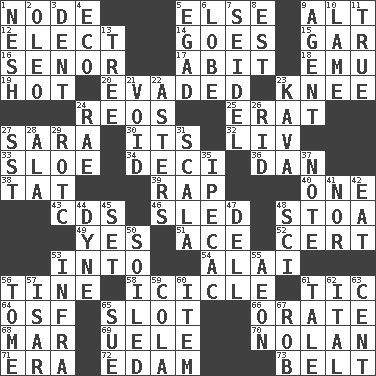 ACROSS 1. Connecting point 5. Otherwise 9. Keyboard modifier key 12. Choose 14. Travels 15. Slender fish 16. Sir (Sp.) 17. "This won't hurt ____!" 18. Australian flightless bird 19. Being at a high temperature 20. Eluded 23. Leg joint 24. Vintage cars 25. Part of Q.E.F. 27. "Two Mules for Sister ____" 30. It is 32. 54 in ancient Rome 33. _ gin 34. Tenth: prefix 36. One of the 12 tribes of Israel 38. Make lace 39. Strike 40. Single 43. Music discs 46. Downhill vehicle 48. Portico 49. Affirmative reply 51. Adept person 52. An absolute certainty 53. To the inside or interior of 54. Jai ____ 56. Prong on a fork 58. Hanging ice 61. Nervous spasm 64. Order of Saint Francis (abbr.) 65. Groove 66. Speak pompously 68. Third mo. 69. Ubangi River tributary 70. Pitcher Ryan 71. Epoch 72. Dutch treat 73. Waist strap DOWN 1. Tender 2. Margarine 3. Incision 4. Environmental prefix 5. Mild oath 6. Ear part 7. A glass for beer 8. Eastern Standard Time (abbr.) 9. Rep 10. Unable to walk 11. Loyal 13. Family _ (genealogy) 21. Empty area or space 22. Michaelmas daisies 23. Polynesian shrub of the pepper family 24. Actress Charlotte 26. To free from 27. Fast jet (abbr.) 28. Insect wing 29. College mil. group 31. Any of the three canals of the cochlea 35. Medicinal drug used to evoke vomiting 37. Observe 41. Not either 42. Ingest 44. Unit of force 45. Put into a specified state 47. Small valley 48. _-fi 50. Dirtied 53. Kind of red light 55. Age 56. Heavy book 57. Austrian river, tributary to the Danube 59. Root beer relative 60. Detail 61. Falsehood 62. Slanted text style (abbr.) 63. Penny 65. Take to court 67. Director Reiner