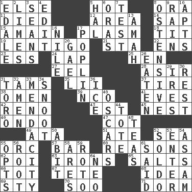 ACROSS 1. Otherwise 5. Being at a high temperature 8. Mouth or opening 11. Passed on 12. Length times width 14. Plant excrement 15. With great haste 17. Suffix with ecto or cyto 18. Teat (slang) 19. Small, flat, pigmented spot on the skin 21. R.R. building 22. Followers of ems 23. Curvy letter 24. Pet locale 25. Layer 27. Snakelike fish 28. SW Saudi Arabia district 31. Scottish caps 35. Cards in a Roman deck? 37. Become fatigued 38. Sign of something about to happen 39. Non-commissioned officer (abbr.) 41. Nights before holidays 42. Former U.S. Attorney General Janet 43. Eastern Standard Time (abbr.) 45. Egg locale 46. Southwest Nigerian state 47. Small bed 49. "One Day ___ Time" 51. Had dinner 52. Ocean 55. The grampus (Milton) 57. Oblong piece of solid material 60. Thinks logically 62. Luau course 63. Removes the wrinkles 65. Table seasonings 66. Small child 67. False hair 68. The content of cognition 69. Filthy place 70. "Barney Miller" actor Jack 71. Dormintory (informal) DOWN 1. Peak District village in England 2. Citrus fruits 3. Seines 4. Prepare for publication 5. Actor Linden 6. Mouths or openings 7. Trial 8. Clearly or manifestly demonstrative 9. Precipitation 10. Tenement units (abbr.) 13. Nursemaid 16. The longest river in the world 17. Cotton for raincoats, e.g. 20. Highlander 26. Eroded 29. Angers 30. Respite 31. "Corrida" creature 32. So be it 33. Ananias' fault 34. Snout, nose 36. Frozen water 40. Motion picture awards 44. Lug 48. Afternoon social gatherings 50. "This won't hurt ____!" 52. Twentieth part of a lira 53. Keyboard key 54. Indian state 55. Chooses 56. Carrot, for example 58. Ancient Greek god of war 59. Printing process, for short 61. Alleged 64. Modern: prefix