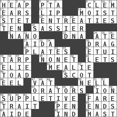 ACROSS 1. Pile 5. Parent Teacher Association (abbr.) 8. To starve (Brit.) 12. Hearing organs 13. Mouth edge 14. Damp 15. Proofreading order 16. Pleas 19. "___ Little Indians" 20. More disrespectful 21. Billionth: prefix 23. Heredity factor (abbr.) 24. Had dinner 27. Opera by Verdi 30. To trail on the ground 31. Food holders 34. Needle holder 35. Canvas cover 38. Music written for nine 40. Allows 41. Writer Wiesel 42. Ear of corn 44. Frog relative 45. Highlander 46. Snakelike fish 47. Large container 50. 1994 drama film starring Jodie Foster 53. Speakers 57. Electrically charged atom 59. Supplementary 63. Conductor's collection 64. Distinguishing feature 65. Writing instrument 66. Extremities 67. Helper 68. Indiana (abbr.) 69. Vertical spar for supporting sails DOWN 1. Command 2. Ingested 3. Sports stadium 4. Pacific Standard Time (abbr.) 5. Entreaty 6. Airtight sealed metal containers 7. Flats, for short 8. Small bed 9. Cards in a Roman deck? 10. Compass dir. 11. Mountains (abbr.) 14. Hindu Mythology: god of death 17. To free from 18. Car or cant ending 20. Earth 22. Slept 24. Johnson of "Laugh-In" 25. Pulled tight 26. The front part of a cuirass 28. One of the 12 tribes of Israel 29. Smallest unit of an element 30. Erase 32. Compass dir. 33. Oceans 35. Wig 36. _ vera 37. Monetary unit of Yemen 39. Affectionate concern, for short 43. Charged particles 47. Electrical Unit 48. "We ___ not amused" (Victoria) 49. Make lace 51. Woody, climbing, usually tropical plant 52. Domineers 54. Native american tent (variation) 55. Baking chamber 56. Tear apart 58. Egg locale 59. R.R. building 60. RI univ. 61. Writing tablet 62. Sliced dessert 63. Opposite of masc.