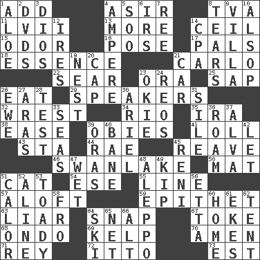 ACROSS 1. Find the sum of 4. SW Saudi Arabia district 8. Federal power corp. 11. 57 in ancient Rome 13. Greater amount 14. To provide with a ceiling 15. Scent 16. Introduce or present, as a question 17. Friends 18. Substance 21. Monte _, Las Vegas Hotel/Casino 22. Singe 23. Mouth or opening 25. Plant excrement 26. Consume 29. Orators 32. Take or capture by force 34. River (Sp.) 35. Lyricist Gershwin 38. Relaxation 39. Off-Broadway awards 41. Hang loosely or laxly 43. R.R. building 44. Actress Charlotte 45. Break or tear apart 46. Tchaikovsky ballet 50. Floor protector 51. Domesticated feline 54. Compass dir. 55. Actor's bit 57. Upward 59. Curse 63. One who doesn't tell the truth 64. Fastener 67. Casino tip 68. Southwest Nigerian state 69. Seaweed 70. So be it 71. Marina Del _, California 72. "Tell ____ the Marines!" 73. Eastern Standard Time (abbr.) DOWN 1. _ vera 2. Movie discs 3. "Vaya con ____" 4. Electrical Unit 5. "Barney Miller" actor Jack 6. Big collection agency 7. To separate or throw off 8. Rends 9. Country residence 10. Columnist Joseph or Stewart 12. Angers 14. Numbers guy (abbr.) 19. Egg locale 20. Head covering 21. 4-wheeled motor vehicle 23. Migrant worker of the '30s 24. Vintage cars 26. She-sheep 27. Caspian sea tributary 28. Trial 30. Satellite of Uranus 31. Filth; sediment 33. Oceans 36. Wander aimlessly 37. Inventor's middle name 39. Mouths or openings 40. Object of repulsion 42. Allow 45. Painter Guido (1575-1642) 47. Dripping 48. City in Syria 49. Monetary unit of Laos 51. Bodily heat indicating an inflammation 52. Place in a line 53. Sycophant 56. Singer James 58. Away 60. Dwelling 61. Makes supply last 62. Portable shelter 64. What Jean-Claude Killy likes to do 65. Fish or hair follower 66. The first octave above the treble staff