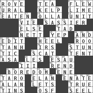 ACROSS 1. Be footloose 5. Afternoon social gathering 8. Soared 12. Mountain range 13. Seaweed 15. Welles in "The Third Man" 16. Consumed 18. Spanish pot 19. A single undivided whole 20. Compete 22. More impudent 24. Otherwise 26. Small amount or degree 27. Remaining after all deductions 28. Slangy assent 29. Added to 32. Prepare for publication 35. Person who is morally reprehensible 37. Friend of Pooh 38. Hyperbolic tangent 39. Big collection agency 40. Surprise greatly 41. Nervous spasm 42. Scram! 43. Portable shelter 44. White ___ sheet 45. French article 46. He sold his birthright 49. One more than two 50. Tear apart 51. Mood resulting from idleness 55. Compass dir. 56. Edible starchy tuberous root 57. Enthusiasm 59. Related on the mother's side 63. ____ Jay Lerner 64. Allows 65. Loyal 66. Airtight sealed metal containers 67. Order of Saint Francis (abbr.) 68. Sew up the eyelids of hawks and falcons DOWN 1. Sorrow 2. Mouth or opening 3. Large container 4. Veterans Day date 5. Ring climax 6. Snakelike fish 7. Silent film actress Nazimova 8. Watery 9. Actor's bit 10. Arab leader 11. Soggy 14. Soft color 17. Mediterranean tributary 21. Eastern Standard Time (abbr.) 23. Plant excrement 25. Moral principles 28. Last 29. Johnson of "Laugh-In" 30. Part of speech 31. Do not 32. Singer James 33. Raised platform 34. South American Indian 36. Epoch 40. SAT takers 42. A glass for beer 45. Falsehood 47. Perceive with the eye 48. Queen of England 1702-14 49. Removes the wrinkles 51. Indonesian resort city 52. NW Algerian seaport 53. Margarine 54. Floor coverings 56. Make lace 58. Overdraft (abbr.) 60. "We ___ not amused" (Victoria) 61. Third day of the wk. 62. Snakelike fish
