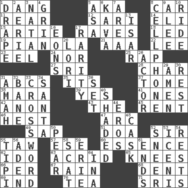 ACROSS 1. Mild oath, euphamism for damn 5. Alias (abbr.) 8. Auto 11. Located in or toward the back 12. Indian skirt 14. Biblical high priest 15. Nick name for Arthur 17. All-night dance parties 18. Directed 19. Player piano 21. American Automobile Association (abbr.) 22. Area sheltered from the wind 23. Snakelike fish 24. Not either 25. Reproach for some lapse or misdeed 27. _ Lanka 28. Burn to charcoal 31. Lettered men learn these first 35. It is 37. Heavy book 38. Hindu Mythology: god of death 39. It is so 41. Singles 42. At once, immediately (arch.) 43. Definite Article 45. Monthly bill 46. Command 47. Curve 49. Plant excrement 51. ___ good deed 52. Title for a knight 55. The 23rd letter of the Hebrew alphabet 57. Compass dir. 60. Gist 62. Wedding promise 63. Bitter 65. Leg joints 66. For each 67. Water falling in drops from the sky 68. Incision 69. Indiana (abbr.) 70. Afternoon social gathering 71. Indian titles of respect DOWN 1. Window treatment 2. Nest on high 3. Relating to or accompanying birth 4. Amused look 5. White ___ sheet 6. Polynesian shrub of the pepper family 7. Type of rug 8. Portable communications device 9. Toward shelter 10. Travel on an animal 13. Austrian river, tributary to the Danube 16. Immeasurably long periods of time 17. Noteworthy scarcity 20. Australian parrot (variant) 26. Thespian 29. So be it 30. State of inaction 31. Nursemaid 32. Object of repulsion 33. What you're doing now 34. Before Barbara or Clara 36. Put into a specified state 40. Cast a shadow over 44. Greek god of love 48. Keg 50. Lightbulb-shaped fruit 52. Contemptuous expression 53. Ancient Celtic tribe of eastern Britain 54. Musical pauses 55. Native american tent (variation) 56. Arabian gulf 58. Get outta here! 59. One of the Great Lakes 61. Extremities 64. _ tizzy (2 wds.)