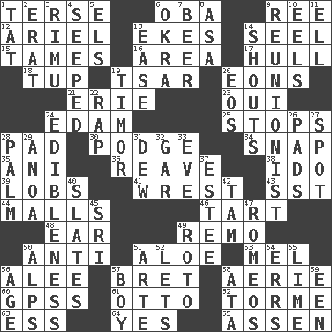 ACROSS 1. Laconic 6. Chief or king in Benin or Nigeria 9. To separate or throw off 12. Satellite of Uranus 13. Makes supply last 14. Sew up the eyelids of hawks and falcons 15. Makes less strong or intense 16. Type of rug 17. Frame or body of a ship 18. Uncastrated adult male sheep 19. Russian ruler of old 20. Immeasurably long periods of time 21. 4th largest of the Great Lakes 23. Fr. "Yes" 24. Dutch treat 25. Obstructs or blocks passage 28. Writing tablet 30. Porridge 34. Fastener 35. Cuckoo 36. Rob, plunder, or pillage 38. Wedding promise 39. Tennis shots 41. Obtain by seizing forcibly or violently 43. Fast jet (abbr.) 44. Shopping centers 46. Small pie 48. Hearing organ 49. San ____ (Riviera town) 50. Opposed to 51. _ vera 53. Cartoonist voice _ Blanc 56. Toward shelter 57. Cy Young winner Saberhagen 58. Nest on high 60. Global Positioning Systems (abbr.) 61. "Beetle Bailey" pooch 62. Singer Mel 63. Curvy letter 64. Consenting reply 65. NE Netherlands city DOWN 1. Make lace 2. Part of Q.E.F. 3. Tall New Zealand timber tree 4. Oozed 5. Raised railways 6. Gumbo ingredient 7. Fermented drink made from hops 8. White ___ sheet 9. One who advocates reunion 10. Snakelike fish 11. Pipe bend 13. Relaxation 14. Yells 19. The easternmost of the Lesser Sundas 20. Greek goddess of the dawn 22. Hit sharply and swiftly 24. The property of being fit to eat 26. Writing tablets 27. Specific locale 28. Inside of hand 29. Small Philippine buffalo 31. Morning condensation 32. Slender fish 33. First lady 37. First name in cosmetics 40. Chalkboards 42. Scottish cap 45. _ Lanka 47. Lover boys 49. Printing process, for short 50. High mountains 51. Johnson of "Laugh-In" 52. Allows 54. Blunders 55. Welles in "The Third Man" 56. Mature 57. Male child 58. _ moment's notice (2 wds.) 59. Car or cant ending