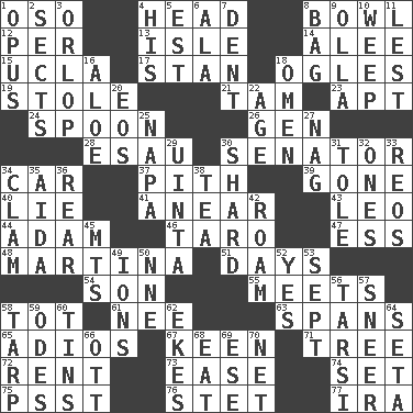 ACROSS 1. Bear (Spanish) 4. Froth on beer 8. Soup holder 12. For each 13. Capri or Wight 14. Toward shelter 15. Southern CA. univ. 17. Comedian Laurel of Laurel & Hardy 18. Stares 19. Took without asking 21. Scottish cap 23. Fitting 24. Soup utensil 26. Commissioned mil. rank 28. He sold his birthright 30. Elected representative 34. 4-wheeled motor vehicle 37. Essential or central part 39. Went 40. Falsehood 41. Approach 43. Lion 44. First man 46. Edible starchy tuberous root 47. Curvy letter 48. Chrissie's court nemesis 51. 24-hour periods 54. Boy, to dad 55. Confronts 58. Small child 61. Born 63. Connects, as a bridge 65. Goodbye (Sp.) 67. Peachy ____! 71. Woody plant 72. Monthly bill 73. Relaxation 74. Put into a specified state 75. Inconspicuous attention getter 76. Proofreading order 77. Retirement account (abbr.) DOWN 1. Musical composition 2. Religious groups 3. Lowest deck of a ship 4. Part of HMS, perhaps 5. Eastern Standard Time (abbr.) 6. In the manner of 7. Incision 8. Paper or plastic container 9. Rounded earthenware pot or jar 10. Shed a tear 11. For fear that 16. _ vera 18. Sign of things to come 20. Greek goddess of the dawn 22. Grow older 25. California wine valley 27. Tired old horse 29. National forest in Provo, Utah 30. Pottery fragment 31. Lacquered or enameled metalware 32. Singles 33. Vintage cars 34. Burrowing marine mollusk 35. Opera by Verdi 36. Hitchcock's "____ Window" 38. Beverage made from leaves 42. Wander aimlessly 45. Mountains (abbr.) 49. Charged atoms 50. Compass dir. 52. Consenting reply 53. Back-to-school mo. 56. Tarsus (plural) 57. Contemptuous expression 58. Canvas cover 59. Lyric poems 60. Airtight sealed metal containers 62. Supplements with great effort 64. Stalk of a moss capsule 66. Baseball player Mel 68. Ingest 69. Compass dir. 70. Fish or hair follower