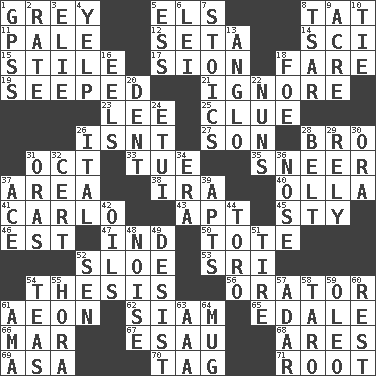 ACROSS 1. Jennifer or Joel 5. Raised railways 8. Make lace 11. Light colored 12. Bristle 14. _-fi 15. Vertical member of a panel or frame 17. The Jewish people; Israel 18. Conductor's collection 19. Oozed 21. Refuse to acknowledge 23. Area sheltered from the wind 25. A slight indication 26. Is not 27. Male child 28. Sis' sibling 31. Sep. follower 33. Third day of the wk. 35. Contemptuous expression 37. Type of rug 38. Retirement account (abbr.) 40. Rounded earthenware pot or jar 41. Monte _, Las Vegas Hotel/Casino 43. Fitting 45. Filthy place 46. Eastern Standard Time (abbr.) 47. Working for oneself (abbr.) 50. Lug 52. A type of plum 53. _ Lanka 54. College paper 56. Speaker 61. Period of immesurable duration 62. Thailand, formerly 65. Peak District village in England 66. Spoil 67. Son of Isaac 68. Ancient Greek god of war 69. White ___ sheet 70. Label 71. Carrot, for example DOWN 1. Global Positioning Systems (abbr.) 2. Assign a rank or rating to 3. Writer Wiesel 4. Sharp bark 5. Double-curved letter 6. Flowery wreath 7. Unemotional ones 8. Russian ruler of old 9. Measure of real estate 10. Neckwear 13. White American of non-Hispanic descent 16. Snakelike fish 18. Enemy 20. Incision 22. Religious women 24. Needle holder 26. Slanted text style (abbr.) 28. Waist strap 29. Have trust in 30. Mouth or opening 31. Mouths or openings 32. Foregone conclusion 34. Epoch 36. Characteristic smell of wine 37. Adept person 39. Flats, for short 42. Lubricates 44. "Corrida" creature 48. Annoying sound 49. Stop 51. Become fatigued 52. Elected rep. 54. Afternoon social gatherings 55. Israeli folk dance 57. The sixth month of the Jewish calendar 58. Pacific island yam 59. Margarine 60. Repose 61. Nursemaid (var.) 63. Auto club (abbr.) 64. Large cup