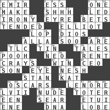 ACROSS 1. Independent ruler or chieftain 5. Curvy letter 8. Single 11. Create 12. Quiet! 14. Directed 15. Literary sarcasm 17. Jane of fiction 18. Wagers 19. Watched over 21. American author Paul (1891-1958) 23. Trim (branches) 25. "Vaya con ____" 26. Silent film actress Nazimova 27. "Barney Miller" actor Jack 28. "We ___ not amused" (Victoria) 31. Affectionate concern, for short 33. Metal container 35. Falsehoods 37. "Silly old bear" 38. Modern: prefix 40. Monthly bill 41. Trading vessels 43. Acquire through effort 45. Corporate head (abbr.) 46. Male offspring 47. Sight organ 50. Delicate 52. Comedian Laurel of Laurel & Hardy 53. Krazy ___ of comics 54. Motion picture awards 56. Poe poem 61. 57 in ancient Rome 62. Naked 65. Carrier 66. Car or cant ending 67. Singe 68. Needle holder 69. Compass dir. 70. Heredity factor (abbr.) 71. Ear part DOWN 1. Send forth 2. Female horse 3. Picture 4. Tear apart 5. Compass dir. 6. Like a shrinking violet 7. Fragments 8. Butter sub 9. Remaining after all deductions 10. Begley and Asner 13. Sun: prefix 16. Shout 18. Twice 20. Stupid person 22. Plunder 24. Ache 26. Painful 28. Toward shelter 29. Western Nevada city 30. Eastern Standard Time (abbr.) 31. "Corrida" creature 32. Grant temporary use of 34. ___ Haven, CT 36. Bowlike part 37. Personal Computers (abbr.) 39. Pig sound 42. Stalk of a moss capsule 44. Be tempered by heat 48. Tall tales 49. Followed as a consequence or result 51. Proofreading order 52. _-fi 54. Baking chamber 55. Trig term 57. Christmas carol 58. "Beetle Bailey" pooch 59. Reuben's nickname 60. One of the Great Lakes 61. Area sheltered from the wind 63. Daniel's nick name 64. Epoch