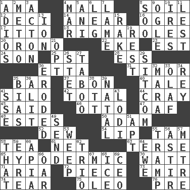 ACROSS 1. Wet nurse (var.) 4. Shopping center 8. The visible part of the earth's surface 12. Tenth: prefix 14. Approach 16. Legendary monster 17. "Tell ____ the Marines!" 18. Complicated, petty procedures 20. U. of Maine site 22. Supplement with great effort 23. Eastern Standard Time (abbr.) 24. Boy, to dad 25. Pacific Standard Time (abbr.) 28. Curvy letter 30. Singer James 31. Southeast Indonesia island 35. Long, evenly shaped piece 37. Inky black, to poets 40. Lie 41. Grain storage tower 42. "_____ Recall" 44. Supercomputer manufacturer 45. Alleged 46. Von Bismarck 47. Clumsy lout 48. _____ Park, CO 50. First man 52. Morning condensation 54. Mouth edge 55. Scottish cap 58. Beverage made from leaves 61. Fish or hair follower 63. Laconic 65. Subcutaneous 70. Electrical Unit 71. Operatic vocal solo 72. Part 73. Independent ruler or chieftain 74. Lacerate 75. Butter sub 76. Before (prefix) DOWN 1. Goodbye (Sp.) 2. Paris' subway 3. Gambison 4. Make imperfect 5. Black tropical American cuckoo 6. Part of a journey 7. Unable to walk 8. "Barney Miller" actor Jack 9. Stare at amorously 10. Angers 11. For fear that 13. Electrically charged atom 15. Immoral or dissolute person 19. Relief 21. Choose 26. Proofreading order 27. Off limits 29. "Cheers" or "Ellen" 30. Worn away 32. Hindu Mythology: god of death 33. Norwegian king 34. Marina Del _, California 35. Prejudice 36. Came down and settled, as after flight 38. Baseball player Mel 39. Brizilian seaport 41. Compass dir. 43. Farming town in central California 49. Post 51. Fitting 53. Shed a tear 55. _____ steamer (cargo ship) 56. Having gotten out of bed 57. Distance measurement (Brit.) 58. Not this but _ 59. Jane of fiction 60. Capital of Western Samoa 62. Musical group of three 64. She-sheep 66. Rowing implement 67. Cartoonist voice _ Blanc 68. Frozen water 69. Corporate head (abbr.)