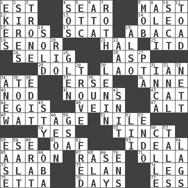 ACROSS 1. Eastern Standard Time (abbr.) 4. Dry up 8. Vertical spar for supporting sails 12. Apertif with cassis 13. Von Bismarck 14. Margarine 15. Greek god of love 17. Go away! 18. Phillipine bananalike plant 19. Sir (Sp.) 21. Actor Linden 23. It would 24. Major League Baseball Commissioner Bud 26. Viper 28. Stupid person 30. Of or relating to Laos or its people 34. Had dinner 37. Celtic language 39. Queen of England 1702-14 40. Allow head to fall sleepily 41. Parts of speech 43. Domesticated feline 44. Armor plate that protects the chest 46. Distinctive style or manner 47. The first octave above the treble staff 48. Electrical Measurement 51. The longest river in the world 54. Consenting reply 55. Colored lightly or faintly 58. Compass dir. 61. Clumsy lout 63. Standard of perfection 65. Composer Copland 67. Raze (variant) 71. Rounded earthenware pot or jar 72. Thick slice 73. Enthusiasm 74. Part of a journey 75. Singer James 76. 24-hour periods 77. Curvy letter DOWN 1. Makes supply last 2. Male parents of animals 3. Marketplace scale 4. Distress signal 5. And so on (abbr.) 6. _ moment's notice (2 wds.) 7. Writer of Portnoy's Complaint (1969) 8. Disorderly crowd 9. Mountain range southwest of Kyrgyzstan 10. Religious group 11. Frog relative 16. Exchanged or delivered for money 18. In addition 20. _ de Janeiro 22. American Automobile Association (abbr.) 25. Small, secluded valley 27. Parent Teacher Association (abbr.) 29. Collection of objects 30. Soviet premier 1918-24 31. South American Indian 32. Of or related to the anus 33. Remaining after all deductions 34. Afresh 35. Ancient Roman robe 36. Prepare for publication 38. Take to court 42. In a ____ (agitated or irritated) 45. Filthy place 49. A really long time 50. Girls' org. (abbr.) 52. Cards in a Roman deck? 53. Inside; within (prefix) 56. Cell (Danish) 57. Stories 58. Comfort 59. Table seasoning 60. Part of Q.E.F. 62. Flintstone 64. Falls behind 66. Chief or king in Benin or Nigeria 68. Insect wing 69. Declare 70. Followers of ems