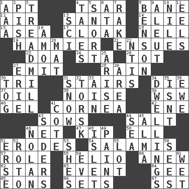 ACROSS 1. Fitting 4. Russian ruler of old 8. Object of repulsion 12. Wind 13. Before Barbara or Clara 14. Writer Wiesel 15. At sea 17. Loose outer garment 18. 1994 drama film starring Jodie Foster 19. More overdramatic by comparison 21. Follows as a consequence or result 23. ___ good deed 24. R.R. building 26. Small child 27. Send forth 28. Water falling in drops from the sky 30. Three (prefix) 31. Flight of steps 34. Pass on 37. Petroleum 38. Annoying sound 39. Compass dir. 40. Set 41. Pupil covering 42. Compass dir. 43. Sty mamas 44. Table seasoning 46. Fish or hair follower 47. Monetary unit of Laos 50. Pipe bend 51. Eats (away) 54. Deli grouping 57. Hero or heavy, e.g. 58. Sun: prefix 60. Afresh 62. Play the lead 63. Happening 64. Unit of force equal to gravity 65. Immeasurably long periods of time 66. Arranges properly for use 67. Fast jet (abbr.) DOWN 1. Auto club (abbr.) 2. Expression of disdain 3. Excercise machine 4. Falsehoods 5. Derisive sound 6. "One Day ___ Time" 7. Libertine 8. Gillaume's butler role 9. Eskimo relative 10. "Death on the ____" 11. Snakelike fish 13. _-fi 16. Mine, in Marseilles 20. Floor covering 22. Nuclear Threat Initiatives 25. Get up 27. One of the Great Lakes 29. Type of rug 30. Coat; cloak 31. Overwhelm 32. Cod relative 33. The 18th letter of the Arabic alphabet 34. Homes 35. Is not 36. She-sheep 41. ____ d'Azur (French Riviera) 43. Spring feasts 44. Ocean 45. _ mater 46. Pitcher Ryan 48. Small island 49. Aches 51. Celtic language 52. Printing process, for short 53. "______ My Girl" (Turtles hit) 55. Car dealer's back yard 56. Perceives with the eye 59. First lady 61. Dripping