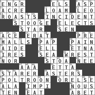 ACROSS 1. Engineer (abbr.) 5. Raised railways 8. Viper 11. 1/640 square mile 12. Rich soil 13. Lion 14. Ridicules or criticizes harshly 17. Happening 19. Moe Howard, for one 21. Opts 22. Play the lead 23. Elected rep. 24. Adept person 27. Part of Q.E.F. 29. Before (prefix) 32. Shopping centers 34. Infant food 36. Ache 37. Helper 38. Pipe bend 39. Inactive volcano in Sicily 40. Angers 41. Ocean 42. Take or capture by force 43. Not either 44. Portico 46. Born 47. American Automobile Association (abbr.) 50. Singer James 52. A viewer who gazes fixedly 55. Michaelmas daisies 57. Coward 59. Threatening words 62. Insect wing 63. Body of Kaffir warriors 64. Good sense 65. "___ Little Indians" 66. Consume 67. Collude with DOWN 1. Ewer handle 2. Non-commissioned officer (abbr.) 3. Pate de foie ____ 4. Musical pauses 5. A really long time 6. Shoestrings 7. Grin 8. Actor Baldwin 9. Posted 10. Plant holders 12. Untruth 15. Lugs 16. Fly high 18. Lair 20. Raisin fruits 24. With great haste 25. Capital of Egypt 26. A person who is older than you are 28. Falsehoods 29. Eucharist need 30. Wash lightly 31. Maternal 33. French article 35. Food holders 36. For each 42. Wetness 45. "Beetle Bailey" pooch 47. Nonscientific branch of learning 48. Nest on high 49. Scent 51. Sports stadium 52. Petty quarrel 53. Lacquered or enameled metalware 54. Actor Alda or Thicke 55. Cuckoo 56. Messy guy 58. Choose 60. Take to court 61. Eastern Standard Time (abbr.)
