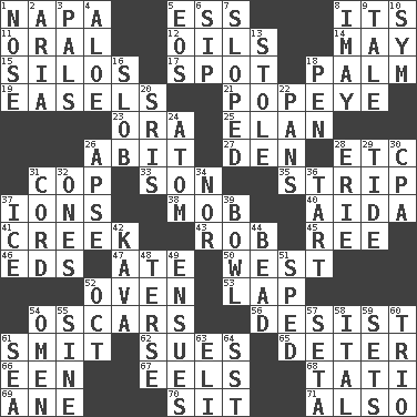ACROSS 1. California wine valley 5. Curvy letter 8. It is 11. Relating to the mouth 12. Lubricates 14. Can I? 15. Grain storage towers 17. Blemish 18. Inside of hand 19. Artist's stands 21. Wimpy's pal 23. Mouth or opening 25. Liveliness 26. "This won't hurt ____!" 27. Lair 28. And so on (abbr.) 31. Police officer (slang) 33. Male child 35. Empty completely 37. Charged particles 38. Disorderly crowd 40. Opera by Verdi 41. Small stream 43. Director Reiner 45. To riddle 46. Begley and Asner 47. Had dinner 50. 270 degrees 52. Baking chamber 53. Pet locale 54. Motion picture awards 56. Cease 61. Stricken, poetically 62. Takes to court 65. Prevent from occurring 66. Car or cant ending 67. Snakelike fish 68. Jacques of French films 69. One (Scot) 70. Be seated 71. In addition DOWN 1. Sense of smell 2. Roberta Peters solo 3. Friends 4. Medicinal plant 5. Greek goddess of the dawn 6. Small drink 7. Had an oblique or slanted direction 8. "If ____ say so..." 9. Lie 10. Symbol (abbr.) 13. Fur scarf 16. Messy guy 18. Fenced enclosure 20. Indian titles of respect 22. Baking dishes 24. Smallest unit of an element 26. Domed church section 28. 4th largest of the Great Lakes 29. Event that recurs at intervals 30. Tax preparer (abbr.) 31. Drawstring 32. Singles 34. Not either 36. Small pie 37. Frozen water 39. Soup holder 42. Polynesian shrub of the pepper family 44. Necklace unit 48. Laconic 49. Follows as a consequence or result 51. Hurried 52. Sep. follower 54. Sign of things to come 55. Trig term 57. Bristle 58. Slanted text style (abbr.) 59. Puts into a specified state 60. Musical group of three 61. Ocean 63. Biblical high priest 64. Fast jet (abbr.)