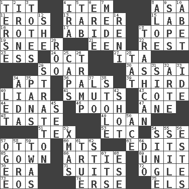 ACROSS 1. Teat (slang) 4. A distinct part 8. White ___ sheet 11. Greek god of love 13. More valued for its uncommonness 15. Experiment locale 16. Writer of Portnoy's Complaint (1969) 17. Remain 18. Drink excessively 19. Contemptuous expression 21. Car or cant ending 22. State of inaction 23. Curvy letter 24. Sep. follower 27. Call ___ day 29. Fly high 30. Slender Brazilian palm 34. Fitting 36. Friends 39. One of three equal parts 40. One who doesn't tell the truth 41. Particles of soot 43. ____ d'Azur (French Riviera) 44. Ferber et al. 46. "Silly old bear" 47. One (Scot) 48. Clothes sense 49. Grant temporary use of 51. John Ritter's dad 53. And so on (abbr.) 54. Compass dir. 57. Von Bismarck 60. Mountains (abbr.) 63. Prepares for publication 65. Bride's dress 66. Nick name for Arthur 69. A single undivided whole 70. Epoch 71. Sets of matching outer garments 72. Stare 73. Greek goddess of the dawn 74. Celtic language 75. Raised railways DOWN 1. Laconic 2. Removes the wrinkles 3. Lugs 4. Retirement account (abbr.) 5. Bar bill 6. 4th largest of the Great Lakes 7. Ancient Persian 8. Medicinal plant 9. Plant excrements 10. Collude with 12. A female animal or person 14. Painter Guido (1575-1642) 18. File 13 20. Friend of Pooh 25. Smile enhancers 26. _____ steamer (cargo ship) 28. Make lace 29. Ski resort town in Vermont 31. The Jewish people; Israel 32. Johnson of "Laugh-In" 33. Binary compound 34. Opera by Verdi 35. Zero-star reviews 37. Nilotic language 38. Took without asking 40. Allow 42. Went for two points 45. Observe 50. Adept person 52. Dec. holiday 54. Burn superficially 55. Free from disturbance or agitation 56. _____ Park, CO 57. Double curve, resembling the letter S 58. "Corrida" creature 59. It was, poetically 61. Loyal 62. Agitate 64. Superhero pair 67. It is 68. Compass dir.
