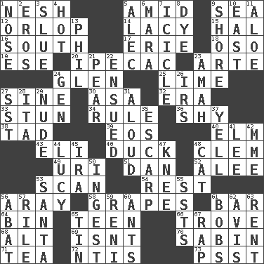 ACROSS 1. Tender 5. Among 9. Ocean 12. Fourth or lowest deck 14. Made of lace 15. Actor Linden 16. 180 degrees 17. One of the Great Lakes 18. Bear (Spanish) 19. Compass dir. 20. Medicinal drug used to evoke vomiting 23. Johnson of "Laugh-In" 24. Small, secluded valley 25. Welles in "The Third Man" 27. Trig term 30. White ___ sheet 32. Period 33. Make senseless or dizzy 34. Court order 36. Like a shrinking violet 38. Bit 39. Greek goddess of the dawn 40. Shade tree 43. Connecticut Ivy Leaguer 46. Evade 48. Clement's nick name 49. RI univ. 51. Daniel's nick name 52. Toward shelter 53. Skim 54. Respite 56. Like ___ of sunshine 58. Raisin fruits 61. Drinking establishment 64. Storage container 65. Adolescent 66. Collection of objects 68. Keyboard modifier key 69. Is not 70. Unit of acoustic absorption 71. Afternoon social gathering 72. Nuclear Threat Initiatives 73. Inconspicuous attention getter DOWN 1. Olfactory organ 2. Greek god of love 3. Turn sharply 4. Being at a high temperature 5. Actor Baldwin 6. Hindu Mythology: god of death 7. Ice on the eave 8. Color 9. Dinah or Pauly 10. Compass direction 11. _ vera 13. Silvers or Donahue 21. Lightbulb-shaped fruit 22. Took place subsequently 23. Nursemaid 24. Commissioned mil. rank 26. Big collection agency 27. Fast jet (abbr.) 28. Call ___ day 29. Naked 31. Verbally 35. Fortification 37. Shout 41. Area sheltered from the wind 42. Madame (abbr.) 44. "I Love _" 45. Lyricist Gershwin 47. Leg joint 48. Domesticated feline 50. Swallow 53. Before Barbara or Clara 55. Fast planes 56. Blind as ____ 57. Cause heat under the collar 59. Painter Guido (1575-1642) 60. Pismires 61. Moves up and down 62. Opinion 63. Monthly bill 65. Shallow baking pan 67. Reproach for some lapse or misdeed