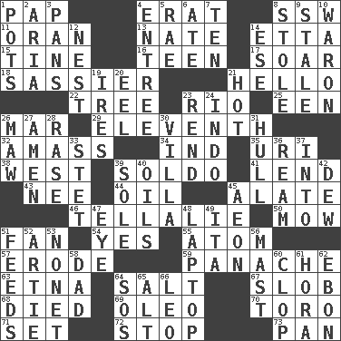 ACROSS 1. Infant food 4. Part of Q.E.F. 8. Compass dir. 11. Northwest Algerian city 13. Nathan's nickname 14. Singer James 15. Prong on a fork 16. Adolescent 17. Fly high 18. More lively and spirited 21. Phone greeting 22. Relationship diagram 23. River (Sp.) 25. Car or cant ending 26. Impair 29. Veterans Day date 32. Collect or gather 34. Working for oneself (abbr.) 35. RI univ. 38. 270 degrees 39. Twentieth part of a lira 41. Grant temporary use of 43. Born 44. Lubricate 45. Having winglike extensions 46. Copy Pinocchio 50. Cut the grass 51. Air blower 54. Consenting reply 55. Tiny particle 57. Wear away 59. Flamboyance 63. Inactive volcano in Sicily 64. Table seasoning 67. Messy guy 68. Passed on 69. Butter sub 70. "Corrida" creature 71. Put into a specified state 72. Cease 73. Baking dish DOWN 1. Cooking vessels 2. Roberta Peters solo 3. Baking dishes 4. Main course 5. Actress Charlotte 6. Had dinner 7. "___ Little Indians" 8. Fur scarf 9. Having lost freshness 10. Make _____ (do battle with) 12. Egg locale 14. Compass dir. 19. Angers 20. Snakelike fish 21. Being at a high temperature 23. Tear apart 24. _ china 26. Opening into something insatiable 27. So be it 28. Raze (variant) 30. Country residence 31. Frame or body of a ship 33. Proofreading order 36. 480, 500 or 516 sheets of paper 37. To the inside or interior of 39. Not divided or shared with others 40. Petroleums 42. Morning condensation 45. A really long time 47. Sight organ 48. Portable computer 49. Call ___ day 51. Gives food to 52. Nick name for Arthur 53. Music written for nine 56. Vertical spar for supporting sails 58. Male parent 60. Hoof sound 61. Israeli folk dance 62. Inky black, to poets 64. Distress signal 65. The first octave above the treble staff 66. Lion