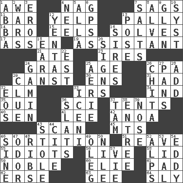 ACROSS 1. Deep reverence 4. Tired old horse 7. Sinks 11. Tavern 12. Sharp bark 13. Chummy 14. Sis' sibling 15. Snakelike fish 16. Finds the solution 17. NE Netherlands city 19. Helper 21. Had dinner 23. Angers 24. Pate de foie ____ 25. Grow older 26. Numbers guy (abbr.) 29. 2nd pers. sing. pres. of can (arch.) 30. Followers of ems 31. Possessed 32. Shade tree 33. Big collection agency 34. Indiana (abbr.) 35. Fr. "Yes" 36. _-fi 37. Portable shelters 40. Elected rep. 41. Area sheltered from the wind 42. Small Philippine buffalo 43. Glance over 45. Mountains (abbr.) 46. Drawing lots 51. Rob, plunder, or pillage 55. Foolish or stupid persons 56. Moving, as bait 58. Hat (slang) 59. Impressive in appearance 60. Writer Wiesel 61. Writing tablet 62. Celtic language 63. Turn to the right 64. Roguish DOWN 1. Swedish rock group 2. Armed conflicts 3. Greek god of love 4. Born 5. Silent film actress Nazimova 6. Global Positioning Systems (abbr.) 7. Table seasonings 8. Inventor's middle name 9. Small, secluded valley 10. System (abbr.) 12. Gossips 13. Introduce or present, as a question 16. Fathers 18. Merit 20. Signals 22. Eastern Standard Time (abbr.) 24. Street urchin 25. Nest on high 26. Riviera of "Kiss of the Spider Woman" 27. Zero-star reviews 28. Find the sum of 29. A slight indication 32. Greek goddess of the dawn 33. Ancient Celtic tribe of eastern Britain 36. Narrow boards 37. Scottish cap 38. Main course 39. Olfactory organ 43. Took without asking 44. Quote 46. Trig term 47. Aroma 48. Teases 49. Cassini of fashion 50. Mediterranean tributary 52. High mountains 53. Small bottle 54. Whirlpool 57. Compete