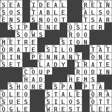 ACROSS 1. Ocean 4. Perfect 9. It's straight from the horse's mouth 13. Distress signal 14. Eating place 15. In addition 16. Followers of ems 17. Snob 18. Russian ruler of old 19. Small drink 21. Compass dir. 22. Flexible twig of a willow tree 24. Sty mamas 26. Friend of Pooh 27. Distance measurement (Brit.) 29. The Jewish people; Israel 30. Declaim 31. Grain storage tower 33. Make lace 36. Storage container 37. Pre-World Series prize 40. Single 41. Arrange properly for use 42. Kenny Rogers chart-topper in '80 43. Feeling or showing extreme anger 45. Clever action or accomplishment 47. "The Thinker" sculptor 48. Possessed 49. Is hesitant and indecisive 50. Dinah or Pauly 52. Health resort 54. Parent Teacher Association (abbr.) 56. Butter sub 57. Showing deterioration from age 59. Mouth or opening 61. Takes to court 62. Grain storage towers 63. Baseball player Mel 64. Stare 65. Obtain by seizing forcibly or violently 66. Area sheltered from the wind DOWN 1. Compass dir. 2. Immeasurably long periods of time 3. Aide 4. ___ a Wonderful Life 5. Natives or inhabitants of Denmark 6. Inky black, to poets 7. Medicinal plant 8. Allow 9. Food allowance for one day 10. Otherwise 11. Austrian river, tributary to the Danube 12. Not either 20. Left side of a ship or aircraft 22. Constellation of myth 23. "Barney Miller" actor Jack 25. Shed a tear 27. Crowds into 28. 4th largest of the Great Lakes 29. Kill 31. Fastener 32. Indiana (abbr.) 33. Inedible or poisonous agaric 34. Against 35. Adolescent 38. Dodge 39. Hoop that covers a wheel 44. Frolic 45. Elect 46. Boat paddle 49. Rings 50. Snaillike creature with no shell 51. Person who is morally reprehensible 52. Disorderly outburst 53. Light colored 55. Johnson of "Laugh-In" 56. Bear (Spanish) 57. Compass dir. 58. Eastern Standard Time (abbr.) 60. Had dinner