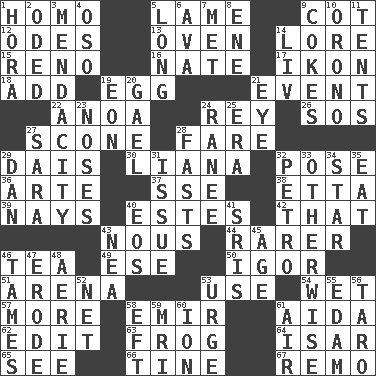 ACROSS 1. Like (prefix) 5. Unable to walk 9. Small bed 12. Lyric poems 13. Baking chamber 14. Old wives' tales, e.g. 15. Western Nevada city 16. Nathan's nickname 17. Visual representation of an object 18. Increase 19. Oval reproductive body of a fowl 21. Incident 22. Small Philippine buffalo 24. Marina Del _, California 26. Distress signal 27. Biscuitlike quick bread 28. Conductor's collection 29. Raised platform 30. Woody, climbing, usually tropical plant 32. Introduce or present, as a question 36. Johnson of "Laugh-In" 37. Compass dir. 38. Singer James 39. Negative votes 40. _____ Park, CO 42. Not this but _ 43. Common sense 44. More uncommon 46. Afternoon social gathering 49. Compass dir. 50. Russian composer Stravinsky 51. Sports stadium 53. Purpose 54. Soggy 57. Greater amount 58. Arab leader 61. Opera by Verdi 62. Prepare for publication 63. Toadlike animal 64. Austrian river, tributary to the Danube 65. Perceive with the eye 66. Prong on a fork 67. San ____ (Riviera town) DOWN 1. Israeli folk dance 2. Wrote a lyric poem 3. Ananias' fault 4. Bear (Spanish) 5. Yearn 6. Actress Gardner 7. Was introduced to 8. Compass dir. 9. Popular sodas 10. U. of Maine site 11. Portable shelters 14. 54 in ancient Rome 19. Age 20. Highlander 21. Sight organ 23. Olfactory organs 24. Indian princess (variant) 25. Epoch 27. "Two Mules for Sister ____" 28. Goes without food and/or water 29. Daniel's nick name 31. Come out of 32. Stone: prefix 33. Else 34. Play the lead 35. Erode 40. Greek goddess of the dawn 41. Indian titles of respect 43. Teachers' org. 45. Personal question 46. Softens 47. Eat (away) 48. Nest on high 52. Fish or hair follower 53. Goad 55. Dutch treat 56. Pacific island yam 58. Newt 59. Medical imaging device (abbr.) 60. Electrically charged atom 61. Wind