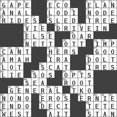 ACROSS 1. Stare wonderingly 5. Environmental prefix 8. Flair 12. Of or related to the anus 13. Farming town in central California 15. Connecting point 16. Amusement-park features 18. Downhill vehicle 19. Woody plant 20. Compete 22. Popular '50s hangout 24. Otherwise 26. Rowing implement 27. Remaining after all deductions 28. Baseball player Mel 29. Mischievous child 32. Patter 35. Possessive pronoun 37. Thick or sticky substance 38. Nanny 39. Lyricist Gershwin 40. Dunce 41. Car dealer's back yard 42. Get outta here! 43. Angers 44. Whopper 45. Mayday 46. Chooses 49. Ocean 50. Carrot, for example 51. Commissioned military rank 55. Ring climax 56. Words to Nanette 57. Greek god of love 59. Bert's buddy 63. Inside; within (prefix) 64. Tenth: prefix 65. False hair 66. Compass direction 67. Small island 68. Comedian Laurel of Laurel & Hardy DOWN 1. Slender fish 2. Cuckoo 3. Groovy apt. 4. Veterans Day date 5. Raised railways 6. Having a low temperature 7. River in Europe 8. Keyboard key 9. Australian parrot (variant) 10. An important port of Yemen 11. Born 14. Foolish or stupid persons 17. Drop; flow; fall 21. Eastern Standard Time (abbr.) 23. Large container 25. Moral principles 28. Speaker 29. Russian composer Stravinsky 30. Undercover agent 31. Cooking vessels 32. Give a ring to 33. Mine, in Marseilles 34. Nathan's nickname 36. Epoch 40. What propaganda does 42. Flew 45. Perceive with the eye 47. Plant holder 48. Puff or smoke 49. Snob 51. Went 52. Extremities 53. Length times width 54. Venues 56. ___ Haven, CT 58. Be seated 60. Fish or hair follower 61. Call ___ day 62. Car or cant ending