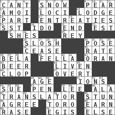 ACROSS 1. Patter 5. Overwhelm 9. Lightbulb-shaped fruit 13. Mine, in Marseilles 14. Event scenes 15. Cabin 16. Component 17. Pleas 19. Fast jet (abbr.) 20. Wedding promise 21. Conclusion 22. Eastern Standard Time (abbr.) 23. "______ My Girl" (Turtles hit) 25. Marina Del _, California 26. Agitate, as a liquid 30. Introduce or present, as a question 34. Desist 35. Assign a rank or rating to 36. Actor Lugosi 39. Man or boy (slang) 42. NW Algerian seaport 43. Fermented drink made from hops 44. Make or become more lively 46. Hoof sound 47. Unconcealed 48. Personal question 51. Charged particles 54. Institute legal proceedings 57. Animal enclosure 58. Area sheltered from the wind 60. In the manner of 62. Interpreter 65. Astound 66. Match 67. "Corrida" creature 68. Merit 69. To erase 70. The front part of a cuirass 71. Otherwise DOWN 1. Smile enhancers 2. Collect or gather 3. Compass direction 4. Teat (slang) 5. Downhill vehicle 6. Words to Nanette 7. Sep. follower 8. One who wires 9. Cooking vessel 10. Singer Brickell 11. Matures 12. Repose 15. Kenny Rogers chart-topper in '80 18. Compass dir. 20. Small island 24. Fortification 27. Clumsy lout 28. Compass dir. 29. Phone greeting 30. Right away 31. Rowing implement 32. R.R. building 33. Car or cant ending 36. English channel? 37. Snakelike fish 38. Lion 40. 54 in ancient Rome 41. "___ Maria" 45. One of the Great Lakes 48. Domed church section 49. Set 50. Maternal 52. Brizilian seaport 53. Plays smoothly or legato 54. Play the lead 55. Capital and largest city of Mongolia 56. Hearing organs 58. Australian parrot (variant) 59. Greek god of love 61. Singer Murray 63. Born 64. Coat; cloak 65. Observe