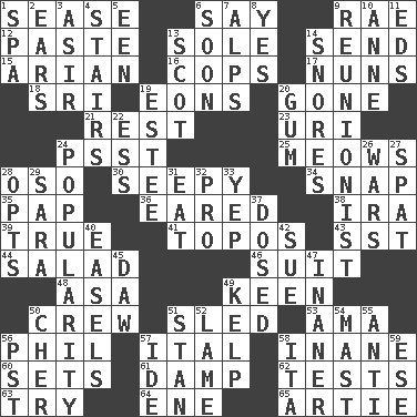 ACROSS 1. Gospel singer Marvin 6. Declare 9. Actress Charlotte 12. Thick mixture 13. Not divided or shared with others 14. Post 15. Believer in; advocate of (suffix) 16. 911 reaches them 17. Religious women 18. Indian title of respect (Mr.) 19. Immeasurably long periods of time 20. Went 21. Take ten 23. RI univ. 24. Inconspicuous attention getter 25. Catcalls? 28. Bear (Spanish) 30. Oozy 34. Fastener 35. Infant food 36. Having ears or earlike features 38. Lyricist Gershwin 39. Loyal 41. Literary convention 43. Fast jet (abbr.) 44. Vegetable dish 46. Set of matching outer garments 48. White ___ sheet 49. Peachy ____! 50. Group working together 51. Downhill vehicle 53. Housemaid (var.) 56. Silvers or Donahue 57. Slanted text style (abbr.) 58. Empty; void 60. Arranges properly for use 61. Moist 62. Trials 63. Attempt 64. Compass dir. 65. Nick name for Arthur DOWN 1. Health resort 2. Hearing organs 3. SW Saudi Arabia district 4. Flight of steps 5. Car or cant ending 6. Within a short period 7. High mountains 8. Affirmative reply 9. One who advocates reunion 10. Queen of England 1702-14 11. Begley and Asner 13. Native of Scotland 14. Sounds asleep 19. First name in cosmetics 20. Chewing product 22. Double-curved letter 24. Teen's desire 26. Armed conflicts 27. Petty quarrel 28. Chooses 29. "Two Mules for Sister ____" 31. Consume 32. Adept person 33. Slangy assent 37. Administered medicine 40. Artist's stands 42. Institute legal proceedings 45. Fool 47. Sillier 49. Seaweed 50. "Mermaids" star 51. Comedian Laurel of Laurel & Hardy 52. Unable to walk 54. Vertical spar for supporting sails 55. Against 56. Pacific Standard Time (abbr.) 57. Binary compound 58. Call ___ day 59. Compass dir.