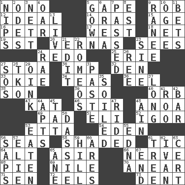 ACROSS 1. Words to Nanette 5. Yawn 9. Director Reiner 12. Perfect 14. Mouths or openings 15. Mature 16. _ dish (used to culture cells) 17. Compass direction 18. Fish or hair follower 19. Fast jet (abbr.) 20. Actresses Bloom and Felton 23. Perceives with the eye 24. Make new 25. One of the Great Lakes 27. Portico 30. Naughty child 32. Lair 33. Migrant worker of the '30s 34. Beverages made from leaves 36. Snakelike fish 38. Boy, to dad 39. Bear (Spanish) 40. Globe 43. Krazy ___ of comics 46. Move through with a circular motion 48. Small Philippine buffalo 49. Writing tablet 51. Connecticut Ivy Leaguer 52. Composer Stravinsky 53. Singer James 54. Genesis locale 56. Oceans 58. Cast a shadow over 61. Nervous spasm 64. Keyboard modifier key 65. SW Saudi Arabia district 66. Impudent aggressiveness 68. Sliced dessert 69. The longest river in the world 70. Approach 71. Elected rep. 72. Snakelike fish 73. Scratch DOWN 1. Cuts off 2. Lyric poems 3. Remaining after all deductions 4. Boat paddle 5. Bride's dress 6. Type of rug 7. Went by 8. Eastern Standard Time (abbr.) 9. Indian princess (variant) 10. Double curve, resembling the letter S 11. Wagers 13. Not recorded 21. Prepare for publication 22. Lover boys 23. Trig term 24. Actress Charlotte 26. To riddle 27. Distress signal 28. Ring climax 29. Pig sound 31. Thick mixture 35. Dirtied 37. Having great length 41. Friend of Pooh 42. Soap unit 44. Flats, for short 45. Make lace 47. Travel on an animal 48. The 18th letter of the Arabic alphabet 50. Small ungulate mammals of Africa 53. Ingested 55. Pulitzer Prize-winning author Ferber 56. Plant excrements 57. Writer Wiesel 59. Land elevation 60. Ancient Greek god of war 61. Relationship diagram 62. _ the terrible 63. Certainty 65. One (Scot) 67. Conclusion