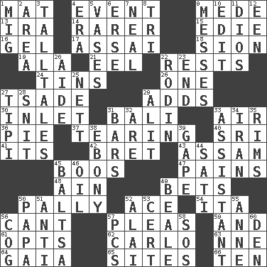 ACROSS 1. Floor protector 4. Happening 9. Ancient Persian 13. Retirement account (abbr.) 14. More uncommon 15. Singer Brickell 16. Set 17. Slender Brazilian palm 18. The Jewish people; Israel 19. Wing 21. Snakelike fish 22. Musical pauses 24. Canisters 26. Single 27. Sadhe (variant) 29. Does sums 30. An arm off of a larger body of water 31. Indonesian resort city 33. Wind 36. Sliced dessert 37. Pulling into pieces 40. Indian title of respect (Mr.) 41. It is 42. Cy Young winner Saberhagen 43. Indian state 45. Expressions of contempt or scorn 47. Aches 48. The 18th letter of the Arabic alphabet 49. Antes 50. Chummy 52. Adept person 54. Call ___ day 56. Patter 57. Entreaties 59. Also 61. Chooses 62. Monte _, Las Vegas Hotel/Casino 63. Compass dir. 64. Greek goddess of the earth (variant) 65. Settings 66. "___ Little Indians" DOWN 1. Russian fighter aircraft 2. Type of rug 3. Baron Munchausen's specialties 4. Period 5. Flower holders 6. Celtic language 7. Anneal 8. Three (prefix) 9. Makes clutter 10. Prepare for publication 11. "Vaya con ____" 12. Car or cant ending 20. Helper 22. "The Thinker" sculptor 23. Conclusion 25. Remaining after all deductions 27. Native american tent (variation) 28. In a ____ (agitated or irritated) 29. Set down 31. Drinking establishments 32. "We ___ not amused" (Victoria) 33. Helper 34. SW Asia republic 35. Basketball hoops 38. Dark wood 39. Yawn 44. Suttee (variant) 45. Greek mezzo-soprano Agnes 46. Petroleum 49. Memphis, Tenn. Street 50. Dad 51. Opposed to 52. Mountain range southwest of Kyrgyzstan 53. Foregone conclusion 55. Singer Murray 56. Gear tooth 57. Personal Computers (abbr.) 58. Distress signal 60. Lair