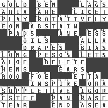 ACROSS 1. Gilt 5. Benjamin's nick name 8. Straggles 12. Roberta Peters solo 13. "We ___ not amused" (Victoria) 14. It is permitted: Lat. 15. Romp 16. Happening in regular succession 19. Age 20. Choose not to consume 21. Groovy apts. 23. A saturated hydrocarbon 24. Curvy letter 27. Petroleums 30. Silent film actress Nazimova 31. Window treatments 34. Prejudice 35. Having great length 38. Mexican monetary units 40. Allows 41. Medicinal plant 42. Keyboard key 44. Coop moms 45. Hearing organs 46. Friend of Pooh 47. Enemy 50. Singer James 53. Heighten or intensify 57. Mouth or opening 59. Supplying deficiencies 63. Russian composer Stravinsky 64. First name in cosmetics 65. Baking dish 66. To erase 67. Separate forcefully 68. Conclude 69. At sea DOWN 1. Yawn 2. Fourth or lowest deck 3. Woody, climbing, usually tropical plant 4. 24 hours 5. Sharp remark 6. Greek god of love 7. Remaining after all deductions 8. 54 in ancient Rome 9. Adept person 10. Set 11. Filthy place 14. Actor's bit 17. Auto club (abbr.) 18. Metal container 20. SW Saudi Arabia district 22. Evades 24. Writer Wiesel 25. Narrow board 26. Backtalk 28. Pet locale 29. Moved rapidly 30. Most capable 32. Compass dir. 33. Flatfish 35. Cowardly lion portrayer 36. Butter sub 37. Words to Nanette 39. Ocean 43. Family _ (genealogy) 47. Do some clerical work 48. Single 49. Eastern Standard Time (abbr.) 51. Ancient Roman robes 52. Came up 54. Corncob 55. _ the terrible 56. Tear apart 58. Type of rug 59. Arrange properly for use 60. Purpose 61. Parent Teacher Association (abbr.) 62. For each 63. Retirement account (abbr.)