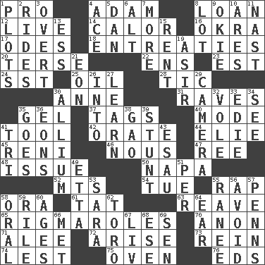 ACROSS 1. Adept person 4. First of billions? 8. Grant temporary use of 12. Moving, as bait 14. Bodily heat indicating an inflammation 16. Gumbo ingredient 17. Lyric poems 18. Pleas 20. Laconic 22. Followers of ems 23. Eastern Standard Time (abbr.) 24. Fast jet (abbr.) 25. Petroleum 28. Nervous spasm 30. Singer Murray 31. All-night dance parties 35. Set 37. Labels 40. Method 41. Implement 42. Declaim 44. Writer Wiesel 45. Painter Guido (1575-1642) 46. Good sense 47. To sift 48. Come out of 50. California wine valley 52. Mountains (abbr.) 54. Third day of the wk. 55. Strike 58. Mouth or opening 61. Make lace 63. Break or tear apart 65. Frustrating wastes of time 70. Soon (poet.) 71. Toward shelter 72. Originate 73. It's straight from the horse's mouth 74. For fear that 75. Baking chamber 76. Begley and Asner DOWN 1. Secret plans 2. Amusement-park features 3. Unconcealed 4. Adept person 5. One of the 12 tribes of Israel 6. Keyboard modifier key 7. Greater amount 8. Car dealer's back yard 9. Migrant worker of the '30s 10. Ancient Greek god of war 11. Political cartoonist Thomas 13. Curvy letter 15. Monthly bill 19. SW Saudi Arabia district 21. Age 26. To the inside or interior of 27. Memorize 29. Device for capturing images 30. Plant genus of onion and garlic 32. Grand slam 33. Singer Brickell 34. Observe 35. Moves 36. Immeasurably long periods of time 38. E Mali city 39. Difficult or unusual or dangerous feat 41. Three (prefix) 43. He sold his birthright 49. Singer James 51. For each 53. "Two Mules for Sister ____" 55. Indian princess (variant) 56. Shun 57. Actor Sean's family 58. Of the mouth 59. Cause heat under the collar 60. Grows older 62. "Corrida" creature 64. Ewer handle 66. Was introduced to 67. 54 in ancient Rome 68. Compass dir. 69. Elected rep.