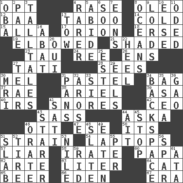 ACROSS 1. Elect 4. To erase 8. Butter sub 12. Sound made by sheep 13. Off limits 14. Having a low temperature 15. Silent film actress Nazimova 17. Greek mythologigal hunter 18. Celtic language 19. Turned at an angle; bent 21. Cast a shadow over 23. The 19th letter of the Greek alphabet 24. To riddle 26. Followers of ems 27. Jacques of French films 28. Perceives with the eye 30. Cartoonist voice _ Blanc 31. Soft color 34. Paper or plastic container 37. Actress Charlotte 38. Satellite of Uranus 39. White ___ sheet 40. Big collection agency 41. Sounds asleep 42. Corporate head (abbr.) 43. Backtalk 44. "____ silly question..." 46. Baseball player Mel 47. Compass dir. 50. It is 51. Put through a sieve 54. Portable computers 57. One who doesn't tell the truth 58. Feeling or showing extreme anger 60. Dad 62. Johnson of "Laugh-In" 63. 61 cubic inches 64. Feline 65. Fermented drink made from hops 66. Genesis locale 67. Epoch DOWN 1. Chief or king in Benin or Nigeria 2. Light colored 3. Baron Munchausen's specialties 4. More valued for its uncommonness 5. Tolerate 6. "Barney Miller" actor Jack 7. Immeasurably long periods of time 8. Seas 9. Domineers 10. Otherwise 11. Wrote a lyric poem 13. Pull behind 16. Blind as ____ 20. Fr. "Yes" 22. The bottom of a shoe or boot 25. First name in cosmetics 27. Pull apart 29. Snakelike fish 30. Medical imaging device (abbr.) 31. Zero-star reviews 32. Came up 33. Title for a knight 34. Keyboard key 35. At sea 36. E Mali city 41. Suttee (variant) 43. A viewer who gazes fixedly 44. Small island 45. Discontinue 46. Speak pompously 48. Chalkboard 49. Eroded 51. Broad, flat, thick piece 52. Hoop that covers a wheel 53. The longest river in the world 55. For each 56. Coast Guard woman 59. To free from 61. "One Day ___ Time"