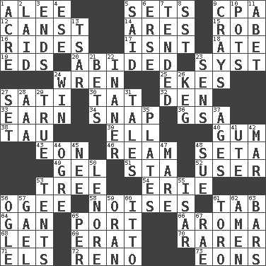 ACROSS 1. Toward shelter 5. Arranges properly for use 9. Numbers guy (abbr.) 12. 2nd pers. sing. pres. of can (arch.) 14. Ancient Greek god of war 15. Director Reiner 16. Amusement-park features 17. Is not 18. Had dinner 19. Begley and Asner 20. Tolerated 23. System (abbr.) 24. Songbird 25. Makes supply last 27. Suttee (variant) 30. Make lace 32. Lair 33. Merit 34. Fastener 36. Girls' org. (abbr.) 38. The 19th letter of the Greek alphabet 39. Pipe bend 40. Chewing product 43. Age 46. 480, 500 or 516 sheets of paper 48. Stalk of a moss capsule 49. Set 51. R.R. building 52. One who makes use of a thing 53. Family _ (genealogy) 54. 4th largest of the Great Lakes 56. Double curve, resembling the letter S 58. Annoying sounds 61. Keyboard key 64. Separate the seeds from cotton 65. Sweet dark-red dessert wine 66. Odor 68. Allow 69. Part of Q.E.F. 70. Less widely known 71. Raised railways 72. Western Nevada city 73. Immeasurably long periods of time DOWN 1. Land measure 2. Put down 3. Extremities 4. Compass dir. 5. Stated 6. Celtic language 7. Watched over 8. Fast jet (abbr.) 9. Trading vessels 10. Plant holders 11. Collude with 13. Russian ruler of old 21. Antes 22. More lacking in sense or substance 23. Elected reps. 24. Victory 26. Cask 27. Put into a specified state 28. American Automobile Association (abbr.) 29. Loyal 31. Falsehoods 35. Food holders 37. Grows older 41. Shoshoni 42. Impair 44. Legendary monster 45. Born 47. Female horse 48. Institute legal proceedings 50. Poe poem 53. Portable shelters 55. Austrian river, tributary to the Danube 56. Stare at amorously 57. Highlander 59. NW Algerian seaport 60. "Tell ____ the Marines!" 61. "Corrida" creature 62. So be it 63. Long, evenly shaped pieces 65. For each 67. Actress Charlotte