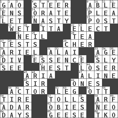 ACROSS 1. E Mali city 4. Bull 9. Competent 13. Followers of ems 14. Declaim 15. Entreaty 16. Allow 17. Thoroughly unpleasant 18. Mail 19. Dripping 21. Call ___ day 22. Voters do this 24. Famous astronaut Armstrong 26. Beverage made from leaves 27. Trials 29. "Mermaids" star 30. Satellite of Uranus 31. Mountain range southwest of Kyrgyzstan 33. Personal question 36. HTML Container Element 37. Center 40. Cunning 41. Perceive with the eye 42. Behest 43. Failure 45. Operatic vocal solo 47. Place in a line 48. Title for a knight 49. Washington bills 50. Thespian 52. Part of a journey 54. Baseball player Mel 56. Hoop that covers a wheel 57. For Whom the Bell _____ 59. Sandy's bark 61. The sixth month of the Jewish calendar 62. Off-Broadway awards 63. Modern: prefix 64. 24-hour periods 65. Honkers 66. Ring climax DOWN 1. Set 2. Afresh 3. Clearly or manifestly demonstrative 4. Male child 5. Lag or linger behind 6. Compass direction 7. Singer James 8. Marina Del _, California 9. Seem 10. Coalition 11. For fear that 12. Ingest 20. Wig 22. Moral principle 23. Area sheltered from the wind 25. Small island 27. Small amounts or degrees 28. One of the Great Lakes 29. Patter 31. At sea 32. French article 33. Helper 34. Small, secluded valley 35. Jane of fiction 38. Bake eggs in their shells 39. Enthusiasm 44. Butter sub 45. Michaelmas daisies 46. _ de Janeiro 49. Stares 50. Opera by Verdi 51. Supercomputer manufacturer 52. Ear part 53. Writer Wiesel 55. Long journey 56. Small boy 57. Coat; cloak 58. Compass dir. 60. Egg _ yung