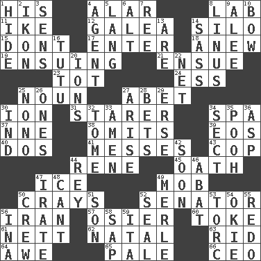 ACROSS 1. Part of HMS, perhaps 4. Having or resembling wings 8. Experiment locale 11. Mamie's mate 12. An organ shaped like a helmet 14. Grain storage tower 15. Do not 17. Keyboard key 18. Afresh 19. Taking place subsequently 21. Follow as a consequence or result 23. Small child 24. Double-curved letter 25. Part of speech 27. Collude with 30. Electrically charged atom 31. A viewer who gazes fixedly 34. Health resort 37. Compass dir. 38. Leaves out 39. Greek goddess of the dawn 40. Two (Sp.) 41. Makes clutter 43. Police officer (slang) 44. French philosopher Descartes 45. Pledge 47. Frozen water 49. Crowd into 50. Trading vessels 52. Elected representative 56. SW Asia republic 57. Flexible twig of a willow tree 60. Casino tip 61. Remaining after all deductions 62. Brizilian seaport 63. To free from 64. Deep reverence 65. Light colored 66. Corporate head (abbr.) DOWN 1. Flintstone garb 2. Visual representation of an object 3. Elected reps. 4. Representative 5. Long (Scottish) 6. The first octave above the treble staff 7. To riddle 8. "_ and Lucy" (Charlie Brown theme song) 9. Toward shelter 10. Arrow shooter 13. "We ___ not amused" (Victoria) 14. Backtalk 16. Ballerina skirt 20. Charged atoms 22. Fish or hair follower 25. Words to Nanette 26. Singles 27. Get up 28. Stakes 29. Celtic language 30. Indiana (abbr.) 32. Heavy book 33. So be it 34. Religious group 35. "Silly old bear" 36. Cleo's killer 42. Within a short period 44. Marina Del _, California 46. Blind as ____ 47. Feeling or showing extreme anger 48. Patter 49. Haggard of country music 50. Group working together 51. Male child 52. Lick closed 53. Torque (variant) 54. Migrant worker of the '30s 55. Redecorate 56. _ tizzy (2 wds.) 58. Plant excrement 59. Call ___ day