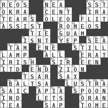 ACROSS 1. Vintage cars 5. Teachers' org. 8. Fast jet (abbr.) 11. Gumbo ingredient 12. Penny 14. Lyricist Gershwin 15. Rends 17. Margarine 18. Secret move to avoid paying debts 19. Help 21. Lover boys 23. Make a knot 25. Island territory of the United States 26. Is not 27. Slangy assent 28. Ocean 31. Scottish cap 33. Compass dir. 35. Not moving 37. Desk light 38. 100% 40. Part of Q.E.F. 41. From or relating to Ireland 43. Title for a knight 45. Car or cant ending 46. It would 47. Conclusion 50. The Jewish people; Israel 52. Russian ruler of old 53. Saxophone 54. Greek mezzo-soprano Agnes 56. A period of five years 61. Ketch in the Levant 62. Capital of Western Samoa 65. Soup utensil 66. Indiana (abbr.) 67. Allows 68. Northwest Algerian city 69. Afternoon social gathering 70. Plant excrement 71. Heavy book DOWN 1. Roll call or roster of names 2. Supplements with great effort 3. Mouths or openings 4. Indian skirt 5. Non-commissioned officer (abbr.) 6. Snakelike fish 7. Disorder of the immune system 8. Grain storage tower 9. Indian titles of respect 10. Make lace 13. Woman's close-fitting hat 16. Fast planes 18. Opposite of masc. 20. Prong on a fork 22. Atlas contents 24. Inactive volcano in Sicily 26. Naughty children 28. Title for a man of rank and authority 29. Enthusiasm 30. The first octave above the treble staff 31. Small pie 32. Among 34. Raised railways 36. Adolescent 37. Cards in a Roman deck? 39. Belonging to Elizabeth 42. Behest 44. Monetary unit of Yemen 48. Relating to the nose 49. Window treatments 51. The longest river in Central Asia 52. Affectionate concern, for short 54. Object of repulsion 55. Opera by Verdi 57. Specific locale 58. "Corrida" creature 59. Wander 60. Singer Murray 61. Be seated 63. Call ___ day 64. Cleo's killer