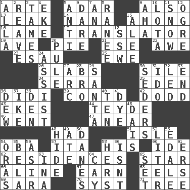 ACROSS 1. Johnson of "Laugh-In" 5. The sixth month of the Jewish calendar 9. In addition 13. Path through which fluid escapes 14. Grandmother 15. Amid 16. Unable to walk 17. Interpreter 19. "___ Maria" 20. Sliced dessert 21. Compass dir. 22. Deep reverence 23. He sold his birthright 25. She-sheep 26. Broad, flat, thick pieces 30. Filth; sediment 34. Father Junipero _ 35. Paradise 36. "You Light Up My Life" star Conn 39. Continued (abbr.) 42. Texas town _ City 43. Supplements with great effort 44. Miss Universe 1986, Barbara Palacios _ 46. Gone 47. Approach 48. Possessed 51. Capri or Wight 54. Chief or king in Benin or Nigeria 57. Call ___ day 58. Part of HMS, perhaps 60. Binary compound 62. Homes 65. Play the lead 66. Place in a line 67. Merit 68. Snakelike fish 69. "Two Mules for Sister ____" 70. System (abbr.) 71. Family _ (genealogy) DOWN 1. Silent film actress Nazimova 2. Rob, plunder, or pillage 3. Corrects by punishment or discipline 4. Make supply last 5. Opposed to 6. Have the gumption 7. Santa ___, CA 8. The wife of a rajah (variant) 9. Nanny (var.) 10. Globular water bottle used in Asia 11. Overwhelm 12. Legendary monster 15. Toward shelter 18. Compass dir. 20. Whine 24. Aid 27. Curve 28. Sis' sibling 29. Before Barbara or Clara 30. Spring feasts 31. Wedding promise 32. Directed 33. Conclusion 36. Morning condensation 37. D.D.E's nickname 38. Lair 40. "___ Little Indians" 41. Color 45. Raised platform 48. Flintstone garb 49. Had dinner 50. Natives or inhabitants of Denmark 52. 61 cubic inches 53. Peak District village in England 54. Mouths or openings 55. Actor Lugosi 56. SW Saudi Arabia district 58. Possessive pronoun 59. Is not 61. Celtic language 63. _ tizzy (2 wds.) 64. Island 65. Arrange properly for use