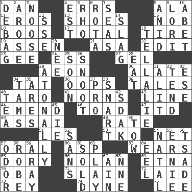 ACROSS 1. Daniel's nick name 4. Blunders 8. Wing 11. Greek god of love 13. Imelda's hoard 15. Crowd into 16. Expressions of contempt or scorn 17. "_____ Recall" 18. Become fatigued 19. NE Netherlands city 21. White ___ sheet 22. Prepare for publication 23. Unit of force equal to gravity 24. Curvy letter 27. Set 29. Period of immesurable duration 30. Having winglike extensions 34. Make lace 36. I made a mistake 39. Lies 40. Edible starchy tuberous root 41. Typical models 43. Actor's bit 44. Make improvements or corrections to 46. Frog relative 47. It would 48. Slender Brazilian palm 49. Pace 51. French article 53. Ring climax 54. Fish or hair follower 57. Taken by mouth 60. Viper 63. Puts on (as clothing) 65. Small, narrow, flatbottom fishing boat 66. Pitcher Ryan 69. Inactive volcano in Sicily 70. Chief or king in Benin or Nigeria 71. Killed 72. Put down 73. Marina Del _, California 74. Unit of force 75. Area sheltered from the wind DOWN 1. Debunk (Brit. slang) 2. Came up 3. Trap for birds or small mammals 4. Eastern Standard Time (abbr.) 5. 17th letter of the Greek alphabet 6. Roll call or roster of names 7. Oceans 8. Among 9. Australian parrot (variant) 10. Collude with 12. Compass dir. 14. Volcanic refuse 18. Copy Pinocchio 20. Born 25. Within a short period 26. Snout, nose 28. Ingest 29. Lacking a tonal center or key 31. Came down and settled, as after flight 32. Be inclined (to) 33. Compass dir. 34. Scottish caps 35. Ancient Greek god of war 37. Adept person 38. Don Adams' spy role 40. Beverage made from leaves 42. Neighbor of Neb. 45. Pass on 50. Pull behind 52. Without 54. Brizilian seaport 55. Bert's buddy 56. Sadhe (variant) 57. Scent 58. Loose flowing garment 59. Like ___ of sunshine 61. Disposed of to a purchaser 62. Shaw product 64. Snakelike fish 67. The 18th letter of the Arabic alphabet 68. Compass dir.