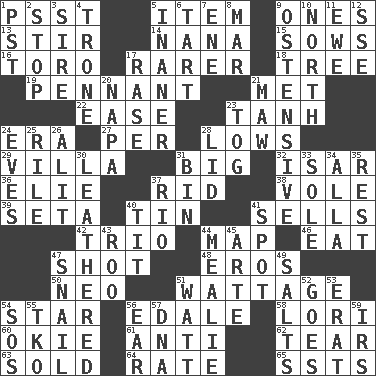 ACROSS 1. Inconspicuous attention getter 5. Detail 9. Washington bills 13. Tumult 14. Nanny 15. Sty mamas 16. "Corrida" creature 17. More valued for its uncommonness 18. Relationship diagram 19. Pre-World Series prize 21. Was introduced to 22. Relaxation 23. Hyperbolic tangent 24. Epoch 27. For each 28. Moos 29. Country estate 31. Massive 32. Austrian river, tributary to the Danube 36. Writer Wiesel 37. To free from 38. Short-tailed, large-bodied rat 39. Bristle 40. Metal container 41. Makes a sale 42. Musical group of three 44. Atlas unit 46. Erode 47. Guess 48. Greek god of love 50. Modern: prefix 51. Electrical Measurement 54. Play the lead 56. Peak District village in England 58. Australian parrot (variant) 60. Migrant worker of the '30s 61. Against 62. Rend 63. Disposed of to a purchaser 64. Assign a rank or rating to 65. Fast planes DOWN 1. Pacific Standard Time (abbr.) 2. Cease 3. Beget 4. Marketplace scale 5. More lacking in sense or substance 6. Small pie 7. Compass dir. 8. Impair 9. Clearly or manifestly demonstrative 10. _ pole 11. She-sheep 12. Compass dir. 17. Raze (variant) 20. California wine valley 21. Informal term for the mouth 23. Coat; cloak 24. Nights before holidays 25. Cause heat under the collar 26. Set down 28. Hat (slang) 30. Tough but pliablecoriaceous 31. Storage container 33. Not divided or shared with others 34. Silent film actress Nazimova 35. Remainder 37. River (Sp.) 40. Teat (slang) 41. Specific locale 43. Friend of Pooh 44. Ear of corn 45. Johnson of "Laugh-In" 47. Slow-paced one 49. Table seasonings 51. Electrical Unit 52. Leaves 53. Part of Q.E.F. 54. Distress signal 55. Ring climax 56. Hearing organ 57. Heredity factor (abbr.) 59. Big collection agency