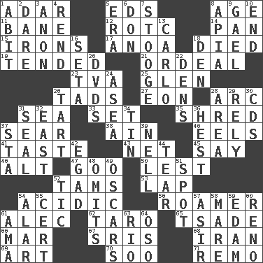 ACROSS 1. The sixth month of the Jewish calendar 5. Begley and Asner 8. Personal question 11. Object of repulsion 12. College mil. group 14. Baking dish 15. Removes the wrinkles 17. Small Philippine buffalo 18. Passed on 19. Watched over 21. Severe or trying experience 23. Federal power corp. 25. Small, secluded valley 26. Bits 27. Age 28. Curve 31. Ocean 33. Put into a specified state 35. Fragment 37. Singe 38. The 18th letter of the Arabic alphabet 40. Snakelike fish 41. Clothes sense 43. Fish or hair follower 45. Declare 46. The first octave above the treble staff 47. Thick or sticky substance 50. For fear that 52. Scottish caps 53. Pet locale 54. Being or containing an acid 56. Nomad 61. Actor Baldwin 62. Edible starchy tuberous root 65. Sadhe (variant) 66. Third mo. 67. Indian titles of respect 68. SW Asia republic 69. Nonscientific branch of learning 70. "Barney Miller" actor Jack 71. San ____ (Riviera town) DOWN 1. "This won't hurt ____!" 2. Have the gumption 3. At once, immediately (arch.) 4. Tear apart 5. Epoch 6. Spanish title 7. Moe Howard, for one 8. Capital of Western Samoa 9. Highlander 10. Conclusion 13. Monte _, Las Vegas Hotel/Casino 16. Bristle 18. Lair 20. Movie discs 22. Hiding places for outlaws 24. Toward the sea 26. Small pie 28. Type of rug 29. Trust 30. Music discs 31. Lick closed 32. 90 degrees 34. Metal container 36. Command 37. R.R. building 39. 1994 drama film starring Jodie Foster 42. Mild oath 44. Separate forcefully 48. Leaves out 49. Motion picture awards 51. Specific locale 52. Nervous spasm 54. Having or resembling wings 55. Certainty 57. SW Saudi Arabia district 58. Female horse 59. Dutch treat 60. Former U.S. Attorney General Janet 61. Nursemaid (var.) 63. _ de Janeiro 64. Bear (Spanish)